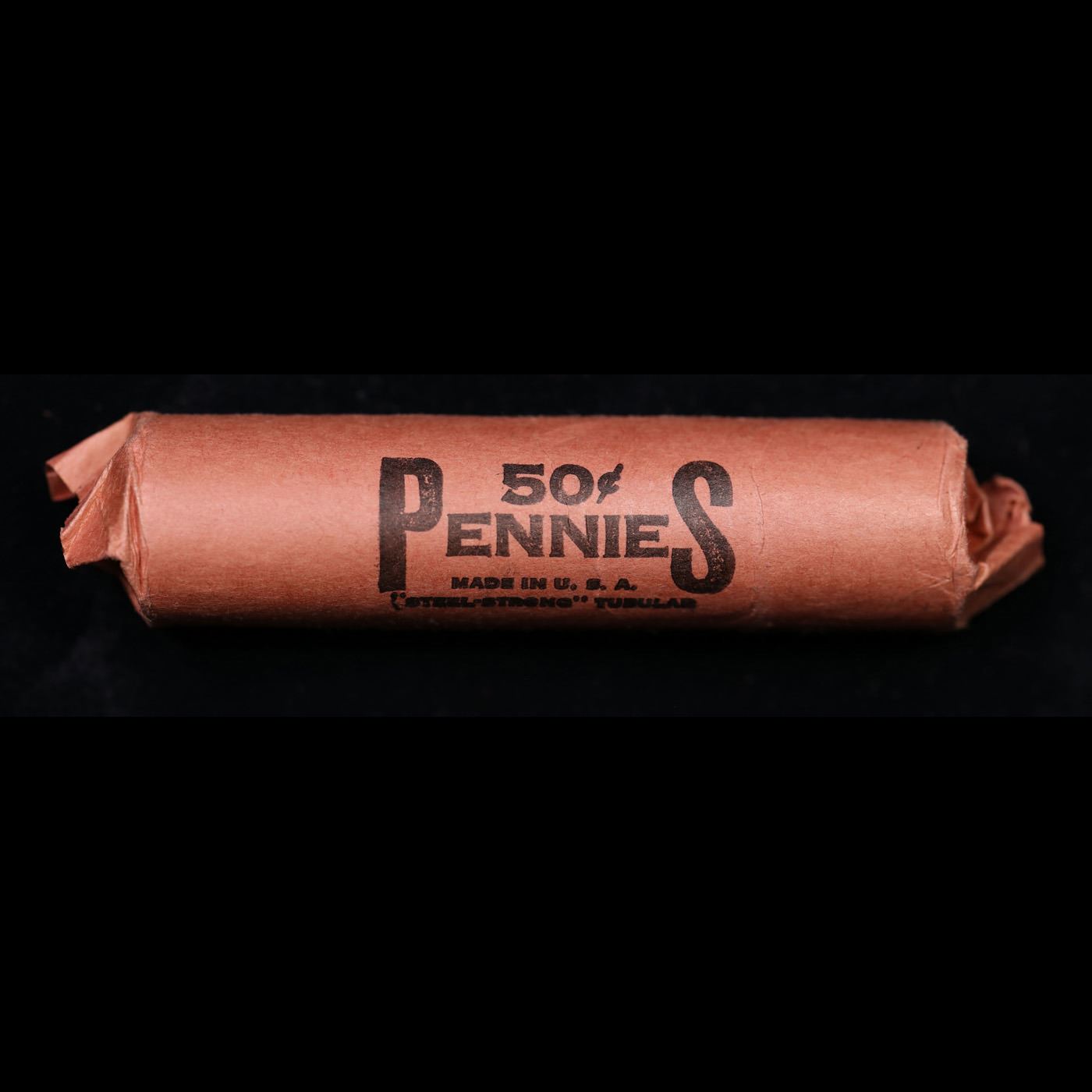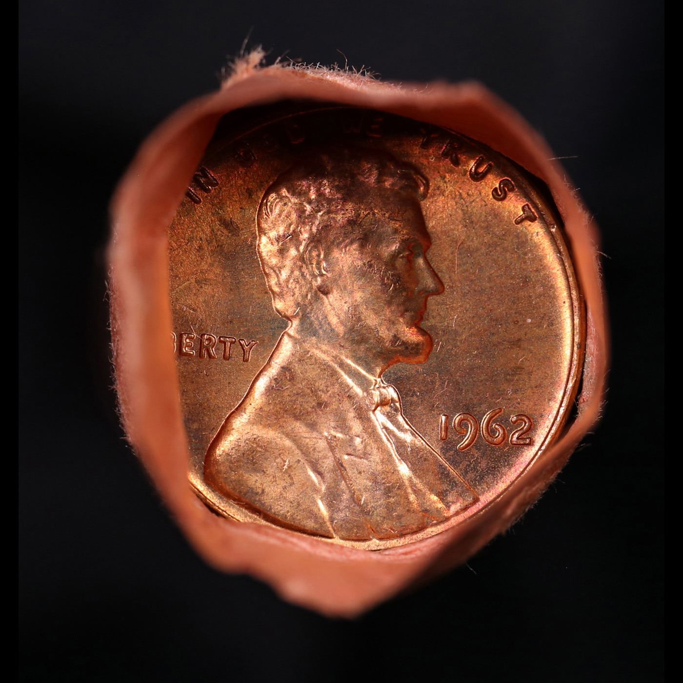 Lincoln 1c roll, 1962-p 50 pcs Vintage "Steel-Strong" Tubular Wrapper.. A terrific Shotgun roll of Lincoln cents. Most if not all coin should be cherry red. Trends ms65 rd $18