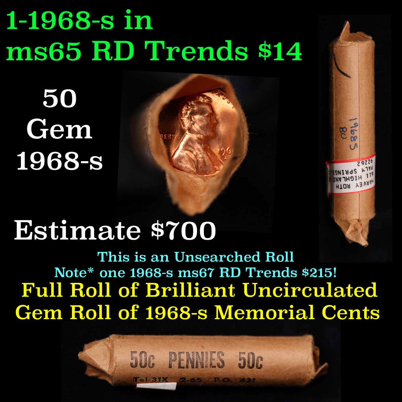 Lincoln 1c roll, 1968-s 50 pcs Wrapper.. A terrific roll of Lincoln cents. Most if not all coin should be cherry red. Trends ms65 rd $14