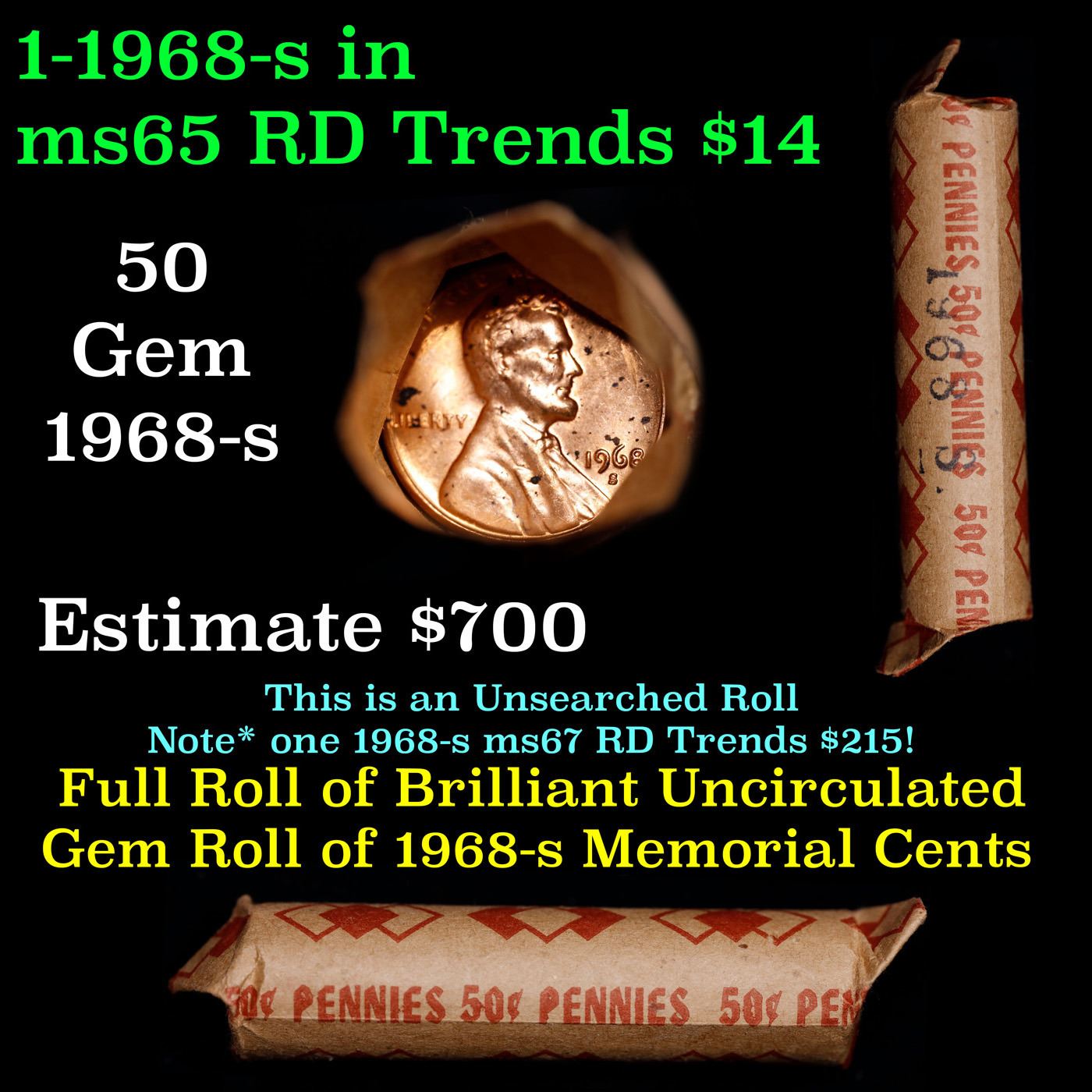 Lincoln 1c roll, 1968-s 50 pcs Wrapper.. A terrific roll of Lincoln cents. Most if not all coin should be cherry red. Trends ms65 rd $14