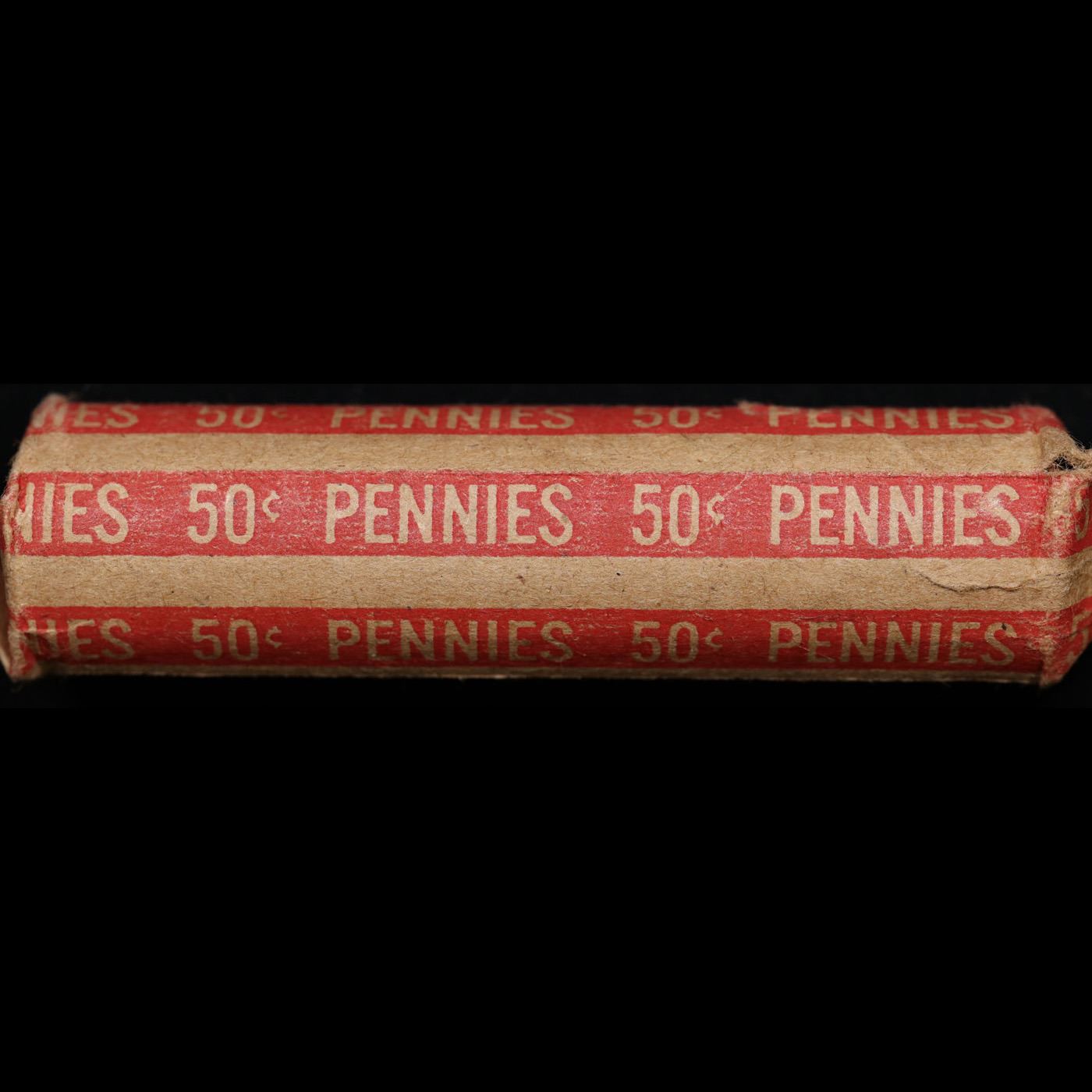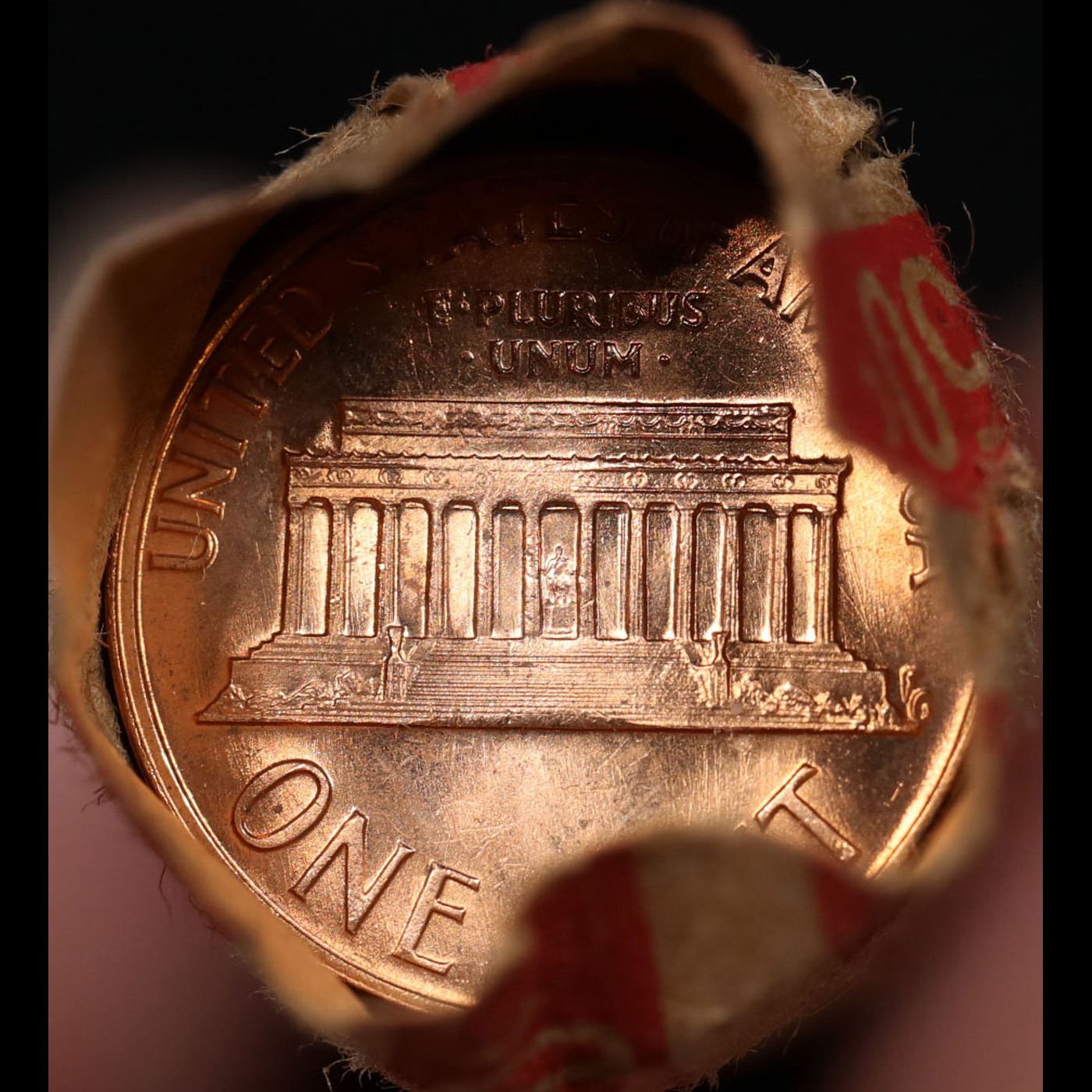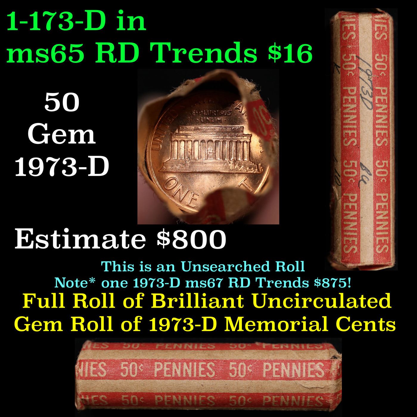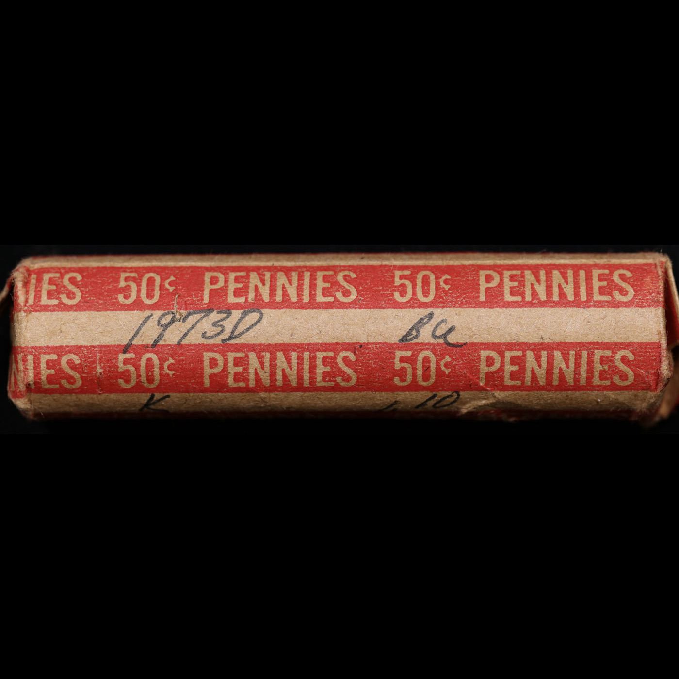Lincoln 1c roll, 1973-d 50 pcs Bank Wrapper.. A terrific Shotgun roll of Lincoln cents. Most if not all coin should be cherry red.