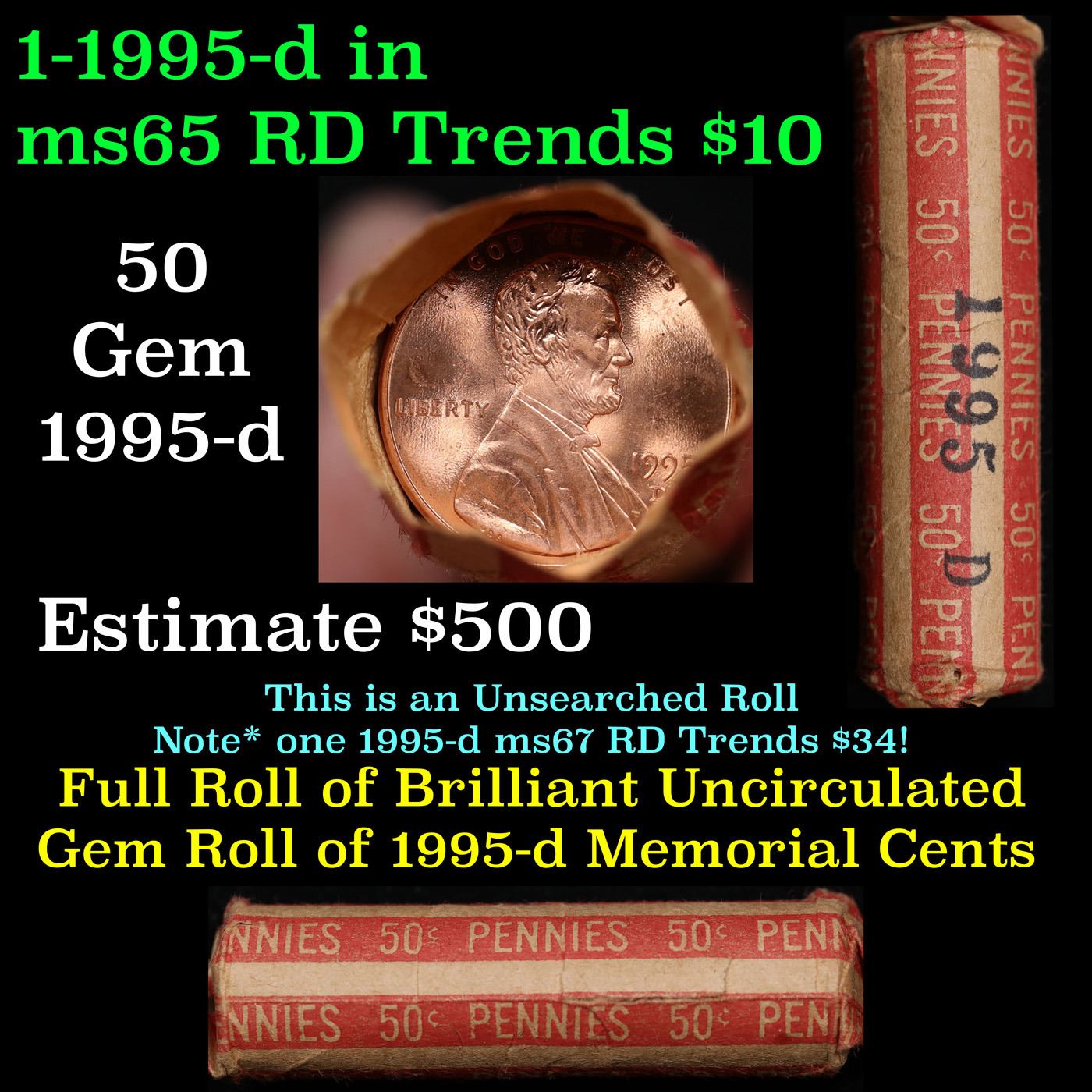 Lincoln 1c roll, 1995-d 50 pcs Bank Wrapper.. A terrific Shotgun roll of Lincoln cents. Most if not all coin should be cherry red.