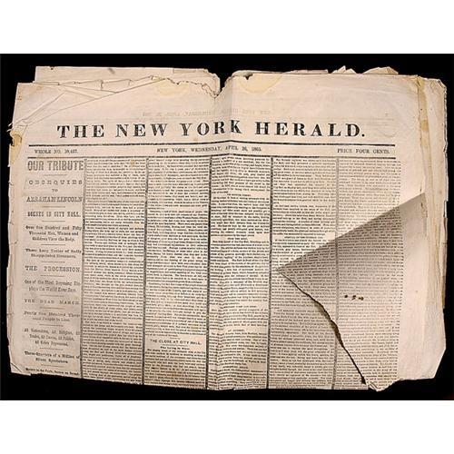 <Our item number 140224><B>[Lincoln, Abe] Early Report of Funeral.</B> The New York Herald Newspaper, Wednesday 26 April 1865. With columns edged in black mourning border, on the reception of Lincoln's body in New York City. "Our Tribute" to the assassinated president, describing the obsequies. Complete but with mouse nibblings to corner folds resulting in moderate loss at center and cross fold. Other clean tears. In only good condition, but mostly clean & bright. Still a highly sought after account of how the country was mourning its beloved president. <BR>Estimated Value $200 - 300. <BR><BR>Our item number 140224<BR><IMAGES><P ALIGN="CENTER"><IMG SRC="http://www.goldbergcoins.net/liveauction/49jpegs/140224.jpg"> </P></IMAGES>