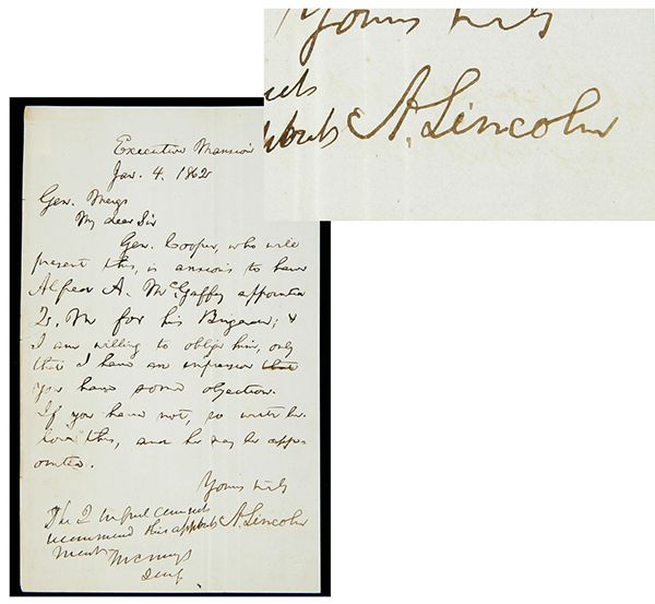 Lincoln, Abraham (1809-65) 16th President of the United States (1861-65). Autograph letter signed ("A. Lincoln" as President, 1 page, 5 x 8 in., Executive Mansion, 4 Jan. 1862. To Brigadier General and Quartermaster of the U.S. Army Montgomery C. Meigs: "Gen. Meigs / My dear Sir / Gen. Cooper, who will present this, is anxious to have Alfred A. McGaffey appointed Q.M. for his Brigade; & I am willing to oblige him, only that I have an impression that ["that" is crossed out] you have some objection. If you have not, so write below this, and he may be appointed."