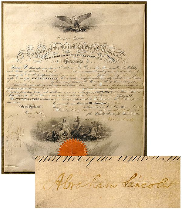 Lincoln, Abraham. Document signed in full as President, 1p, vellum, 16¾ x 13¾ in., Washington, 3 Mar. 1865. Countersigned by Gideon Welles as Secretary of the Navy. Appointing William G. Temple a Commander in the Navy. Very good; some soiling and wear to vellum; one horizontal fold passes through the Lincoln's signature, which is a little light but quite legible. Matted with a portrait of Lincoln and framed to an overall size of 37 x 22½ in.
