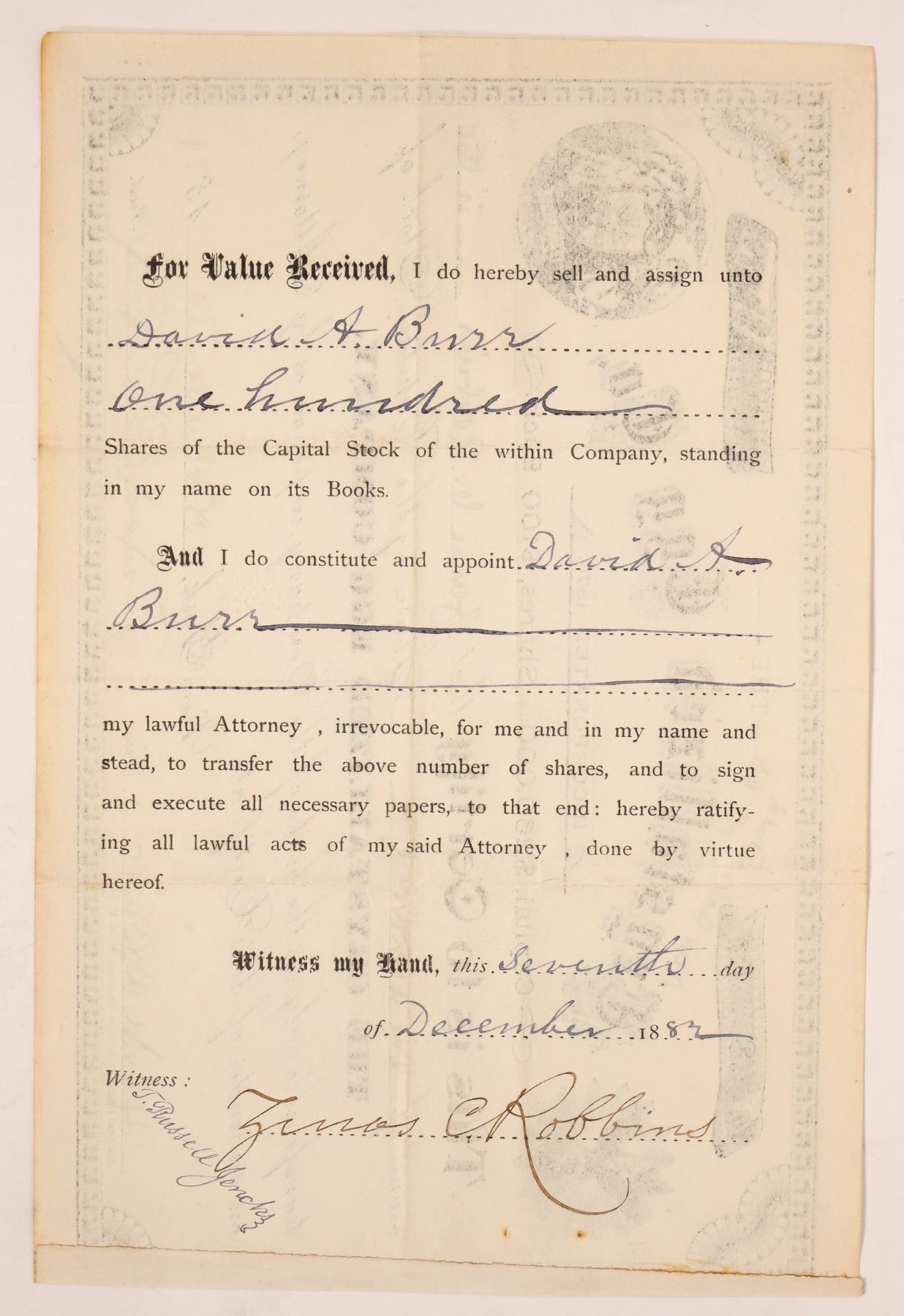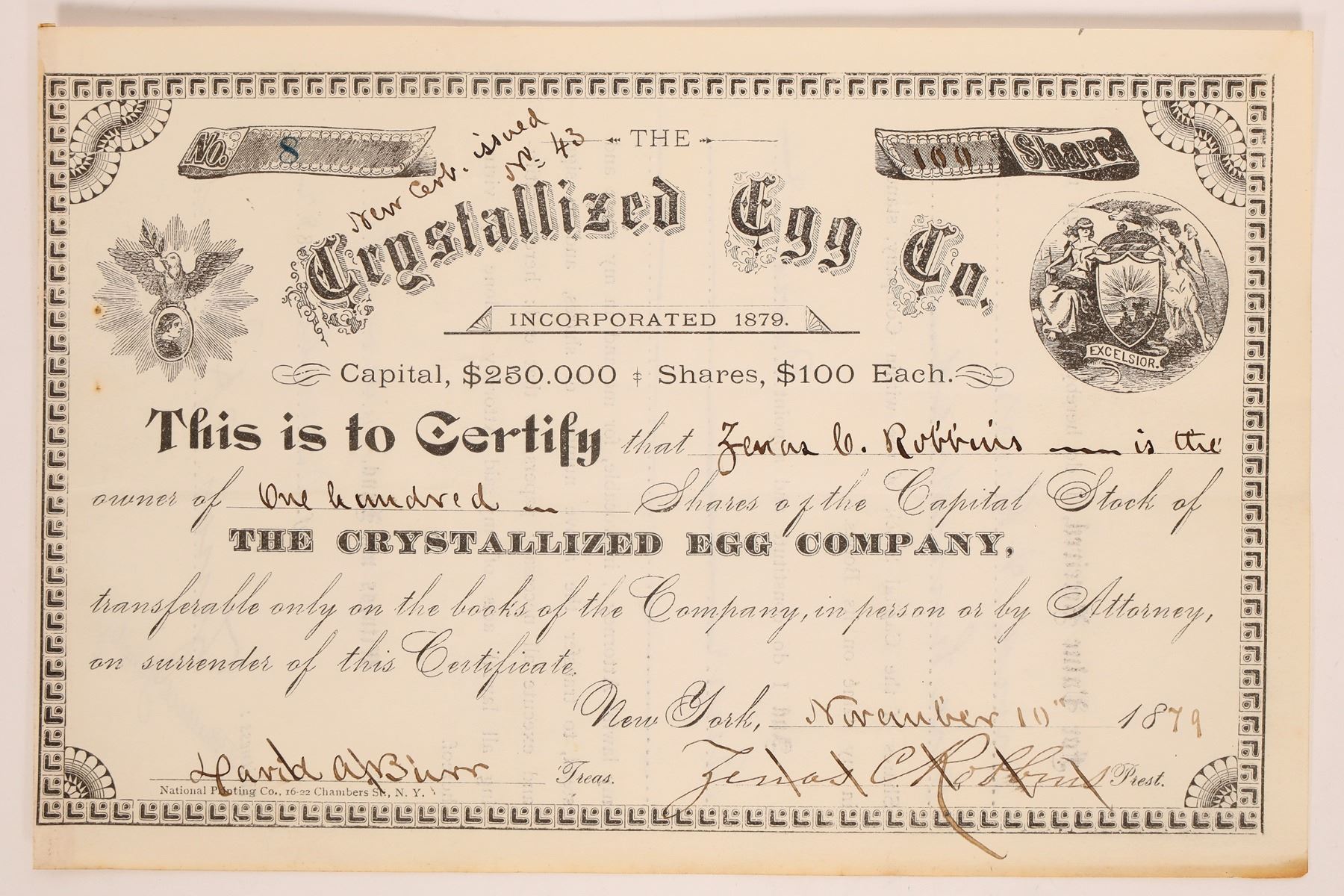 Issued to and signed by Zenas C. Robbins, an attorney, patent agent, police commissioner, and register of wills. Dated November 10th, 1879; good for 100 shares in the Crystallized Egg Co. In 1861, President Lincoln appointed Robbins as a police commissioner for the District of Columbia, and in 1862, Lincoln appointed him register of wills for the District.