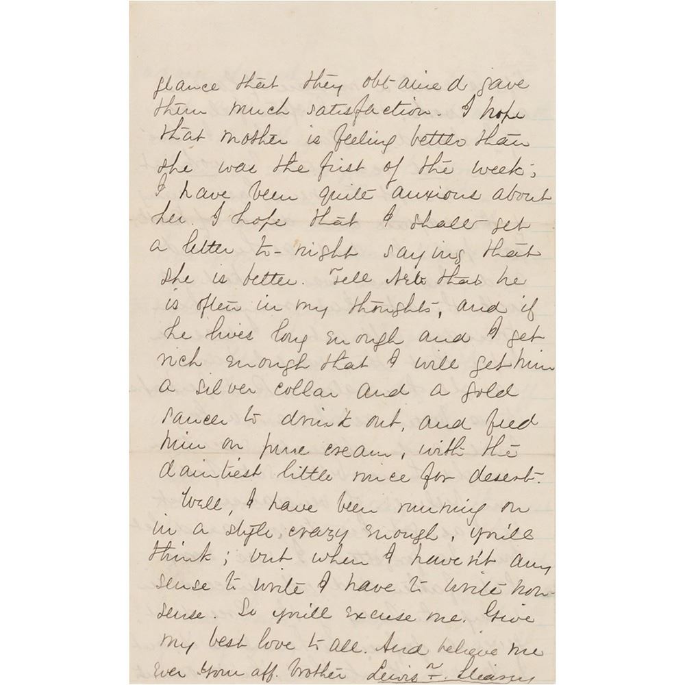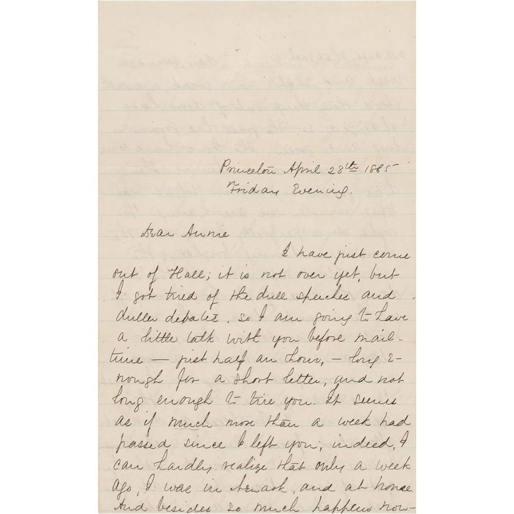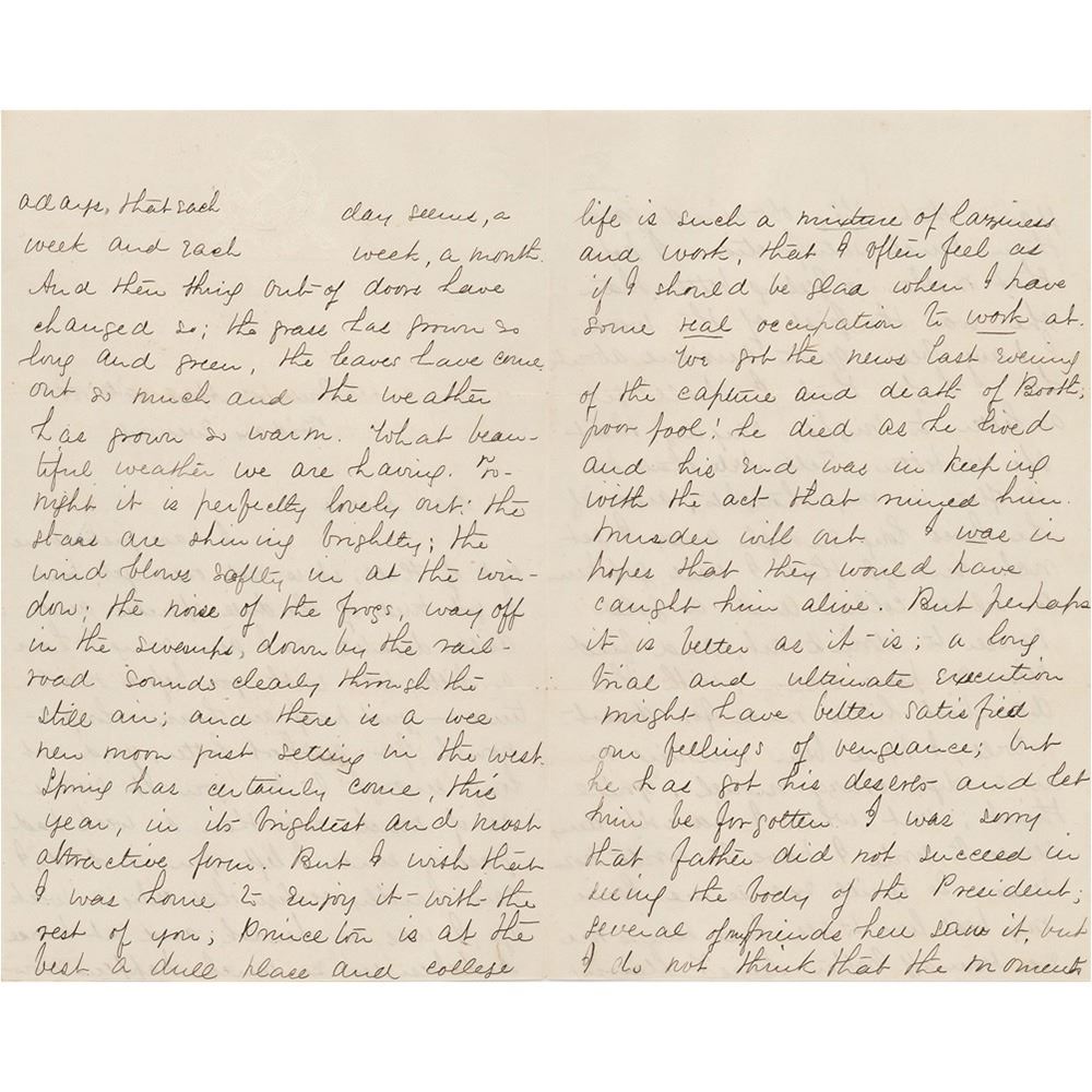 ALS, four pages on two adjoining sheets, 5 x 8, Nassau Hall letterhead, April 28, 1865. Handwritten letter by Princeton student Lewis T. Stevens to his sister Annie, regarding the capture and death of Lincoln's assassin, John Wilkes Booth, in part: "We got the news last evening of the capture and death of Booth, poor fool! He died as he lived and his end was in keeping with the act that ruined him. Murder will out. I was in hopes that they would have caught him alive. But perhaps it is better as it is; a long trial and ultimate execution might have better satisfied one feelings of vengeance; but he has got his desserts and let him be forgotten. I was sorry that father did not succeed in seeing the body of the President; several of my friends here saw it, but I do not think that the moments glance that they obtained gave them must satisfaction." In fine condition.