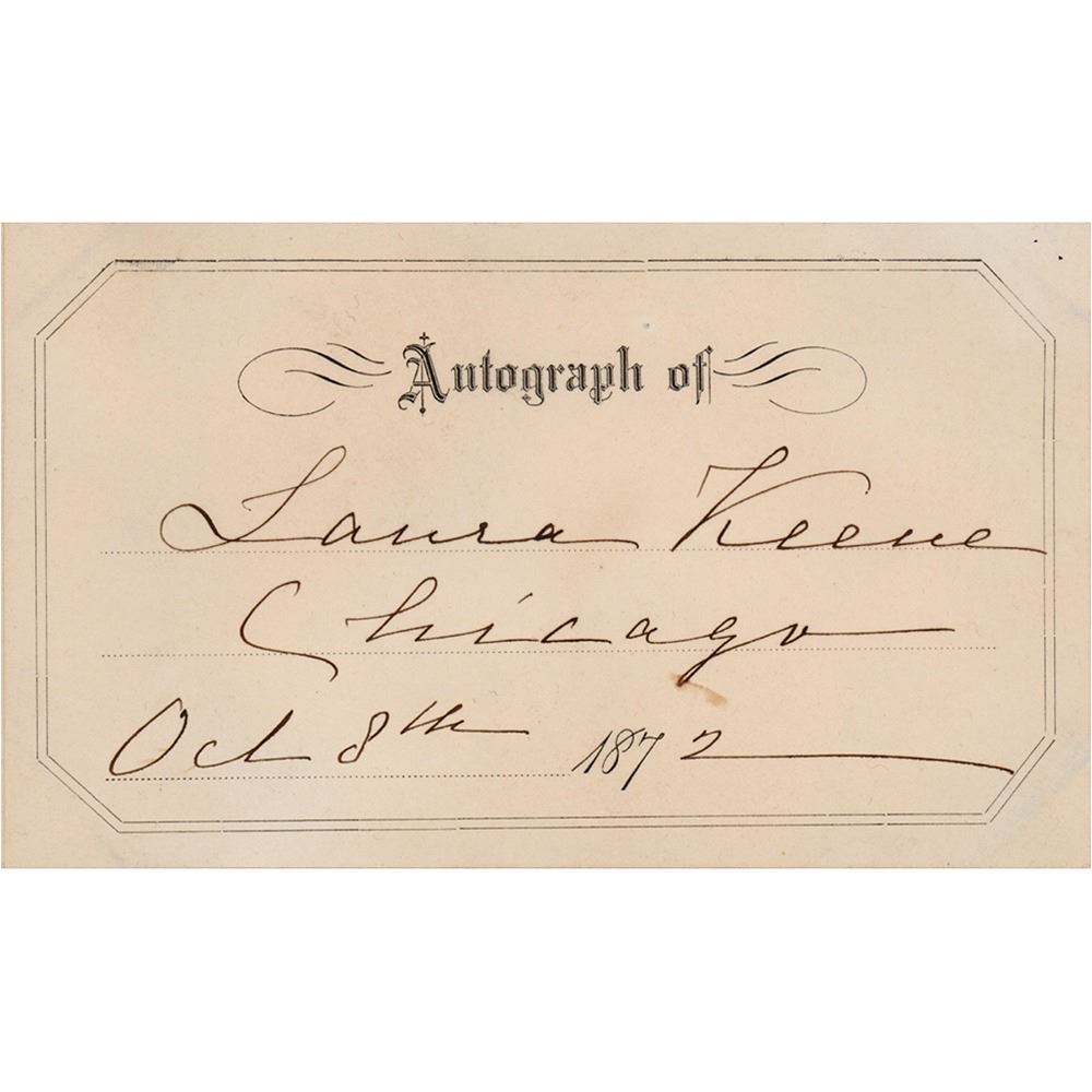 Stage actress and manager (1826-1873) whose company was playing Our American Cousin at Ford's Theatre on the night of Lincoln's assassination. After he was shot, she entered his box and tried to comfort him, cradling his head in her lap. Ink signature, "Laura Keene, Chicago, Oct. 8th, 1872," on an off-white 4.5 x 2.75 card. In fine condition.