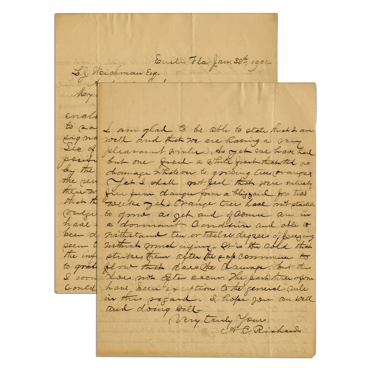 Abraham Lincoln assassination letter, from Almarin C. Richards, Metropolitan Police Superintendent responsible for tracking down the conspirators, to Louis Weichmann, chief prosecution witness at the conspirators' trial. This letter, dated 30 January 1901, is part of Richards' correspondence with Weichmann in preparation for Weichmann's book on the assassination. He declines to join Weichmann in an official request to the War Department to find out where John Wilkes Booth is buried. Booth was shot and killed by soldiers a few days after the assassination; his remains were in government custody for several years before being privately buried by the Booth family. Richards' letter reads in part, ''...I prefer not to place my signature to the enclosed letter to the Sec. of War inquiring as to the final disposition of the remains of J. Wilkes Booth by the War Department. I presume that if the remains were turned over to [Booth's brother] Edwin there was an agreement or understanding that the arrangement should not be divulged to the public as otherwise it would have long ago been reported what had been done with the body. The note would seem to put me in the position of seeking the information in question from a mere desire to gratify curiosity which I do not entertain...'' Intriguing letter whose subject matter -- doubts concerning the remains of a Presidential assassin -- mimics the events a century later with the body of Lee Harvey Oswald. 7.75'' x 9.75'' single page letter, written front and verso, is in very good condition.