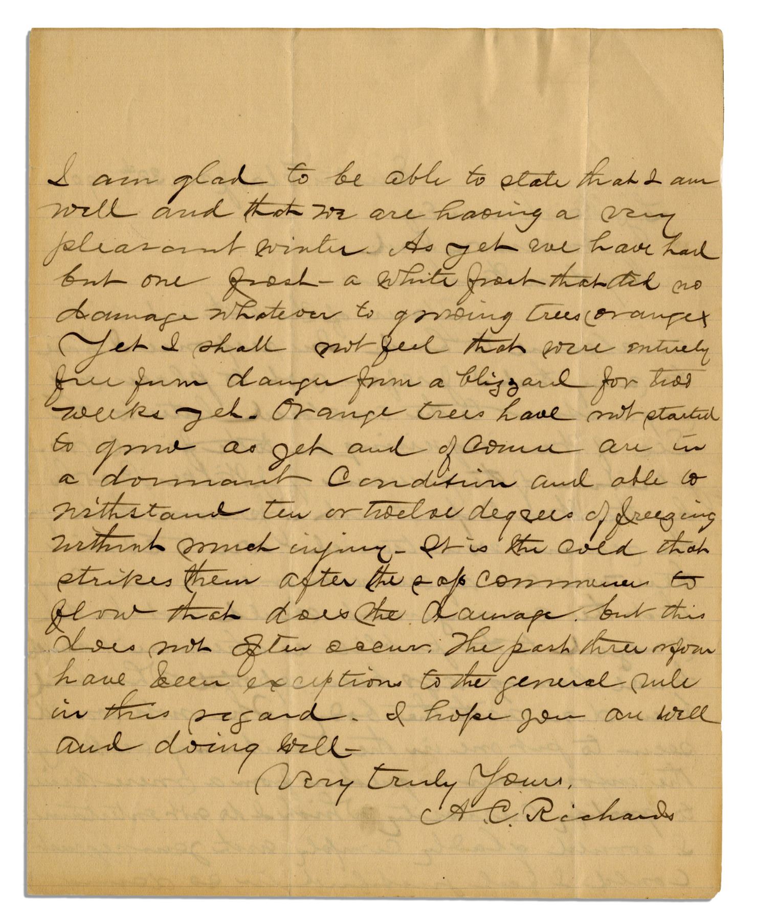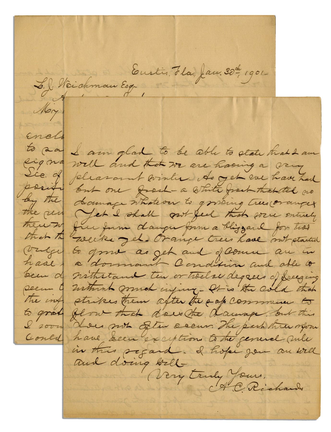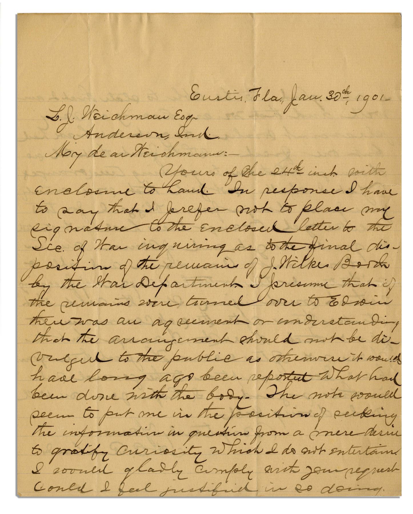 Abraham Lincoln assassination letter from Almarin C. Richards, Metropolitan Police Superintendent responsible for tracking down the conspirators, to Louis Weichmann, chief prosecution witness at the conspirators' trial. This letter, dated 30 January 1901, is part of Richards' correspondence with Weichmann in preparation for Weichmann's book on the assassination. He declines to join Weichmann in an official request to the War Department to find out where John Wilkes Booth is buried. Booth was shot and killed by soldiers a few days after the assassination; his remains were in government custody for several years before being privately buried by the Booth family. Richards' letter reads in part, ''...I prefer not to place my signature to the enclosed letter to the Sec. of War inquiring as to the final disposition of the remains of J. Wilkes Booth by the War Department. I presume that if the remains were turned over to [Booth's brother] Edwin there was an agreement or understanding that the arrangement should not be divulged to the public as otherwise it would have long ago been reported what had been done with the body. The note would seem to put me in the position of seeking the information in question from a mere desire to gratify curiosity which I do not entertain...'' Intriguing letter whose subject matter -- doubts concerning the remains of a Presidential assassin -- mimics the events a century later with the body of Lee Harvey Oswald. 7.75'' x 9.75'' single page letter, written front and verso, is in very good condition.