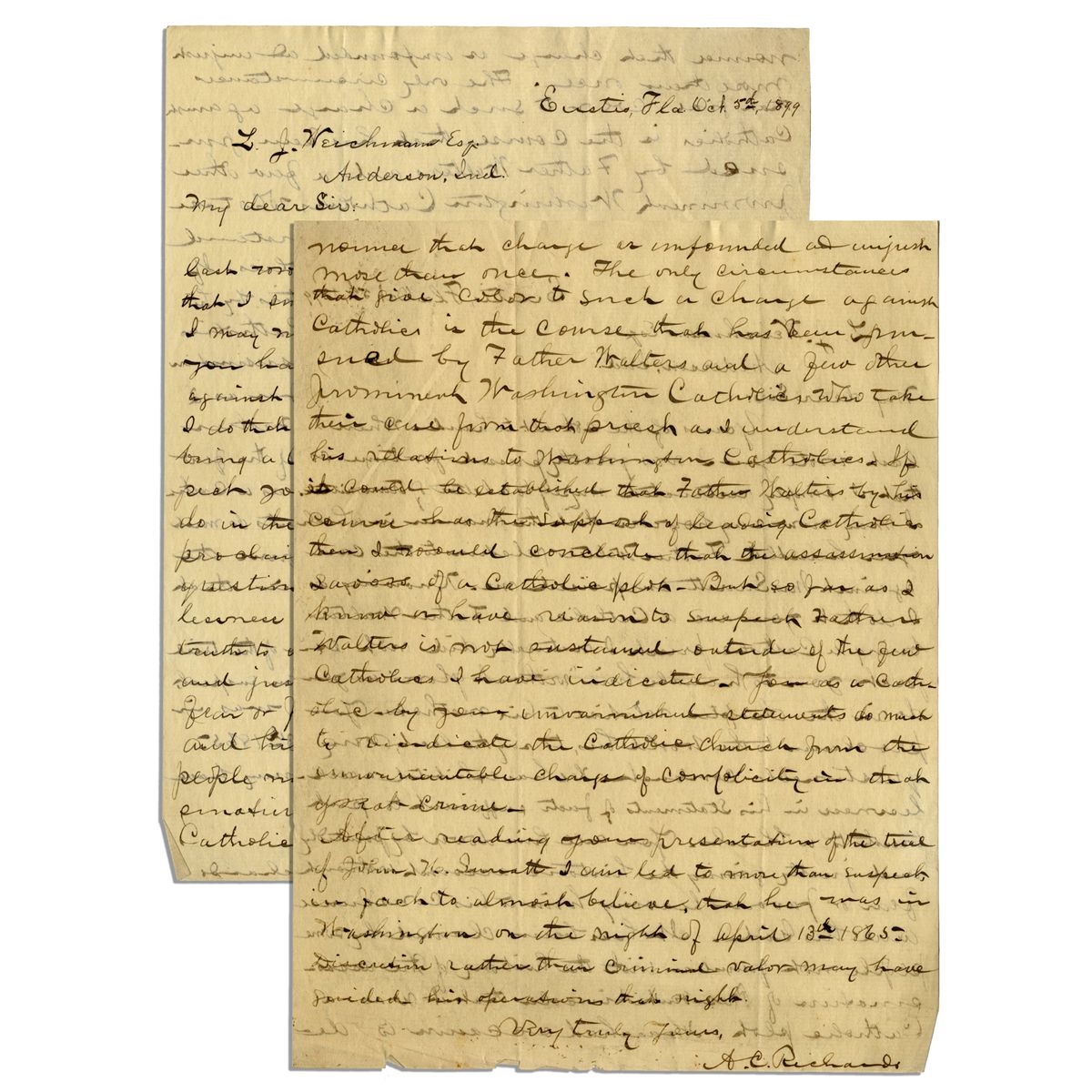 Letter by Almarin C. Richards, D.C. Police Superintendent during the Lincoln assassination, to Louis Weichmann, former friend of the Surratt family woh testified against them. Richards reviews his account of events for Weichmann's book on the assassination in this 5 October 1899 letter. Anti-Catholic sentiment ran high during the Civil War and, here, Richards refers to a theory that the assassination was a Catholic plot and to statements of Father Walter, the priest who ministered to Mary Surratt, imprisoned conspiracy suspect who was ultimately hanged. He ends with a statement about John Surratt, Mary's son, a suspected conspirator who fled Washington, D.C., avoiding conviction for the crime. ''...the manner in which you handled Father Walter's relations to the case against Mrs. Surratt surprised me. Knowing as I do that you are a Catholic and Father Walter's being a Catholic priest I naturally did not expect you to handle him 'without gloves' as you do...You proclaim to the world his...very questionable conduct. He has exhibited a recklessness in his statements of facts sufficient to put truths to a blush. You call him down by pointedly and justly giving the historic account without fear or favour leaving him to his conscience and his God...It has been claimed by some not familiar with the history of the assassination...that it was a Catholic plot...Your unvarnished statements do much to vindicate the Catholic church from...complicity in that great crime...After reading your presentation of the trial of John H. Surratt, I am led to more than suspect, in fact to almost believe, that he was in Washington on the night of April 13th 1865...'' Minor chipping to bottom of 7.75'' x 9.75'' single page letter, written front and verso. Overall very good.