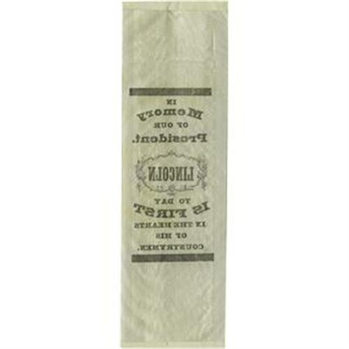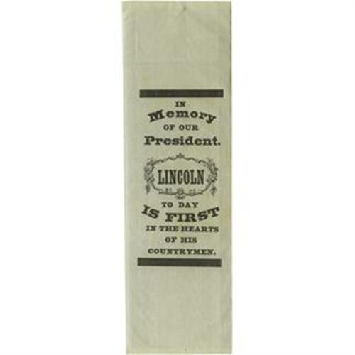 <B>Lincoln Assassination Mourning Badge.</B></I> Measuring 7.75" x 2.25", displaying a white background with black printing. It reads, "In Memory of our President. Lincoln to day is First in the Hearts of his Countrymen." In choice, extremely fine condition.