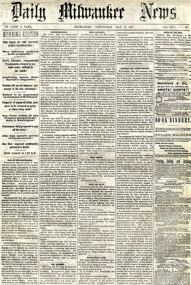 ''Daily Milwaukee News'' regarding Lincoln assassination trial. ''Trial'' article reads in part, ''…J. Ritterspaugh testified he was employed in Ford's theater when the president was shot; he saw the assassin run across the stage and followed him…and when the witness returned, Spangler struck him, saying, 'for God's sake, don't say which way Booth went'…'' Broadsheet measures 12.25'' x 19.75” and runs 8pp. in bold print. Minor tears at edges and creases not affecting text. Good condition.