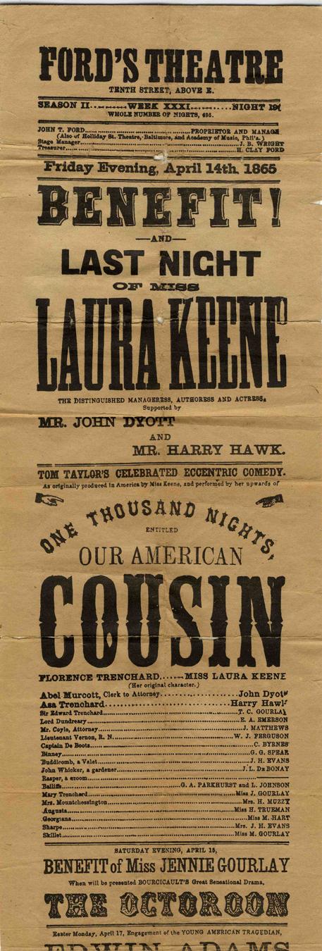 1909 reproduction of the Ford's Theatre play advertisement the night of Lincoln's assassination. This April 1865 theatrical broadside for ''Our American Cousin'' was meant to be a celebration of the “last night” of actress Miss Laura Keene but instead, proved to be the site of Lincoln's assassination by John Wilkes Booth. 1909 reproduction by Los Angeles company ''A. Hamburger & Sons'' printed at bottom. Measures 6'' x 22''. Splits along folds, tape repaired to verso and chipping to edges. Small holes at fold intersections. Good condition.