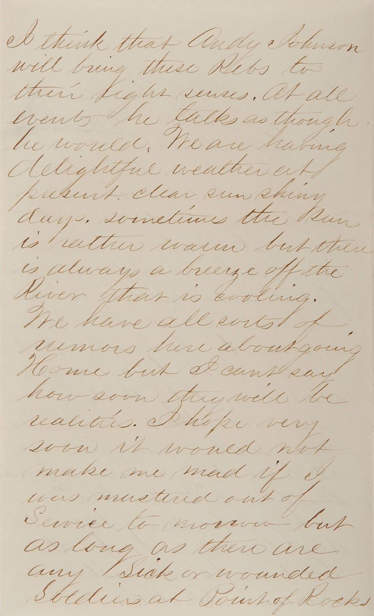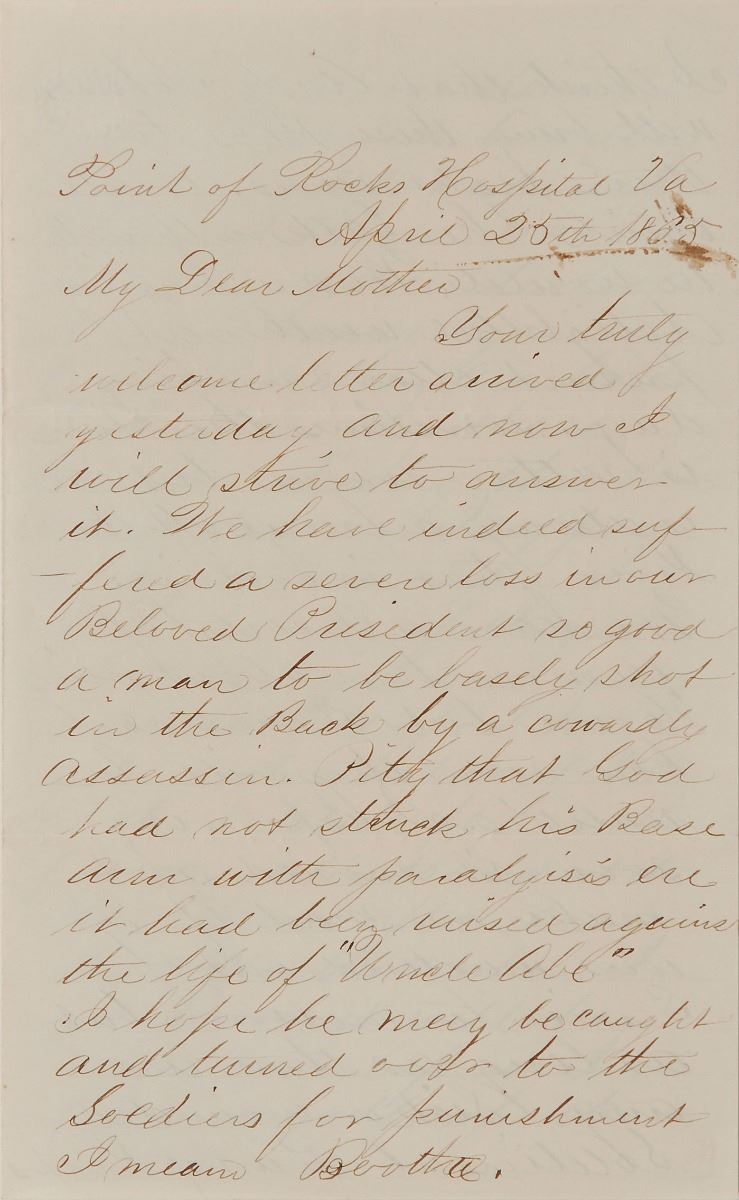 ALS signed “William M. Cooper,” four pages on two adjoining sheets, 5 x 8, April 25, 1865. Letter written from Point of Rocks Hospital, Virginia, in part: “We have indeed suffered a severe loss in our Beloved President so good a man to be basely shot in the Back by a cowardly assassin. Pity that God has not struck his Base Arm with paralysis ere it had been raised against the life of ‘Uncle Abe.’ I hope he may be caught and turned over to the Soldiers for punishment I mean Boothe. I think that Andy Johnson will bring these Rebs to their right senses. At all events he talks as though he would….We have all sorts of rumors here about going home but I can’t say how soon they will be realities.” In fine condition. Booth was tracked down and killed the next day in Port Royal, Virginia, about sixty miles north of Point of Rocks.