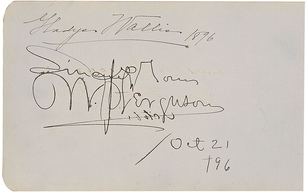 Actor (1845–1930) who was the call boy at Ford's Theatre when John Wilkes Booth shot President Lincoln and fled. Ferguson was described as the last surviving eye witness. Rare ink signature, “Sincerely yours, W. J. Ferguson, Oct 21/96,” on a light blue 7.5 x 4.75 album page. Page is also signed by Gladys Wallis above Ferguson, and on the reverse by Nellie McHenry. In fine condition, with a couple of light brushes to signature and some slight mirroring of ink from a signature on the opposite page.