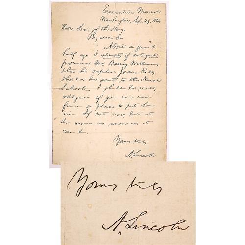 <Our item number 139744><B>Lincoln, Abraham.</B> Autograph letter signed as President, 1p, 7 x 5 in., Executive Mansion, Washington, 29 Sept. 1864. To "Hon. Sec. of the Navy" [Gideon Welles] about a promise Lincoln had "almost, if not quite" made to place a nephew of a friend into the Naval Academy: "About a year & half ago I almost, if not quite promised Mr. Barney Williams that his nephew James Kelly should be sent to Naval School. I shall be really obliged if you can find a place to put him in. If not now, let it be done as soon as it can be…." <BR><BR>According to Basler, Kelly received an at-large appointment by the President on 5 Oct. 1864. Very good; fold wear, light toning, and a few small margin repairs on verso. Excellent content. <BR>Estimated Value $18,000 - 22,000. <BR><BR>Our item number 139744<BR><IMAGES><P ALIGN="CENTER"><IMG SRC="http://www.goldbergcoins.net/liveauction/49jpegs/139744.jpg"> <BR><IMG SRC="http://www.goldbergcoins.net/liveauction/49jpegs/139744N2.jpg "> </P></IMAGES>
