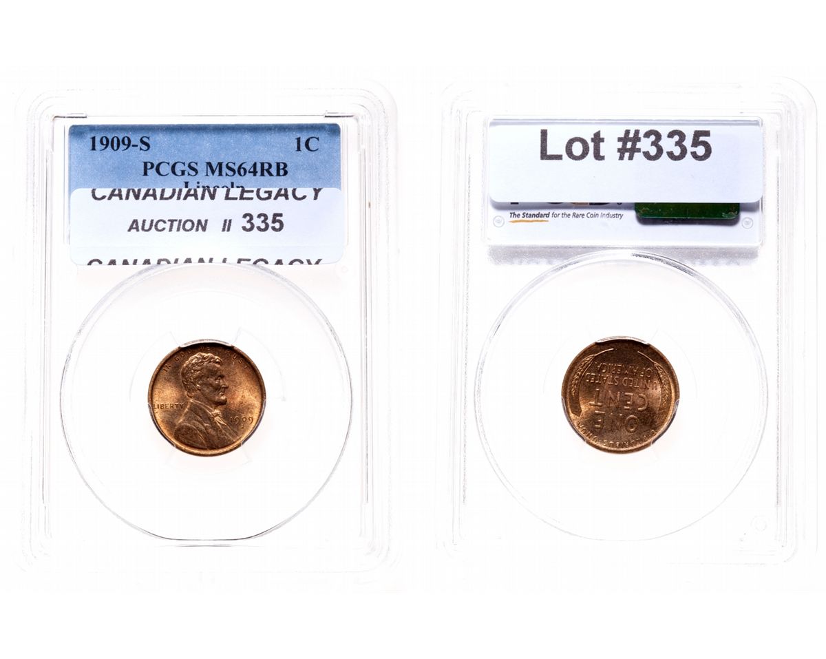 Lincoln Cent. 1909-S. PCGS graded Mint State-64. Red-Brown. 65% red luster.