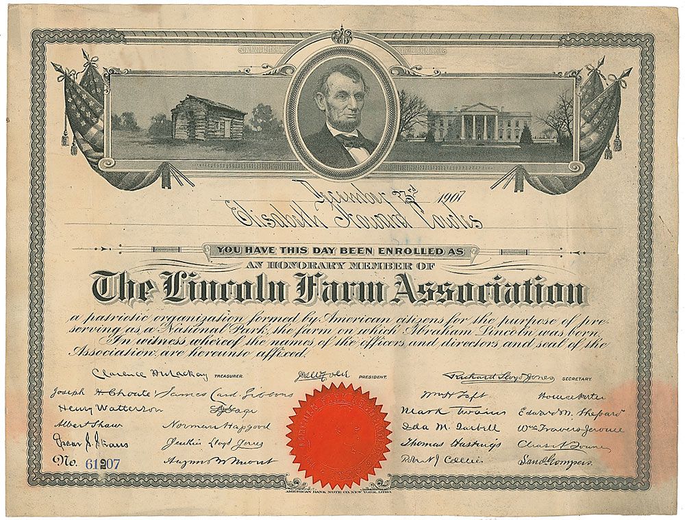 Certificate for honorary enrollment in the Lincoln Farm Association, 11.25 x 8.5, December 23, 1907, bearing an image of Lincoln at the top and facsimile signatures of the Association's officers at the bottom, which include Mark Twain, William Howard Taft
