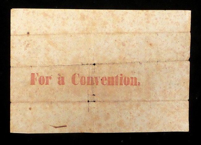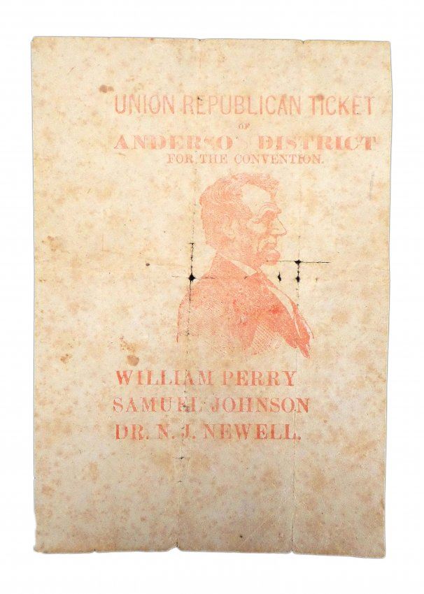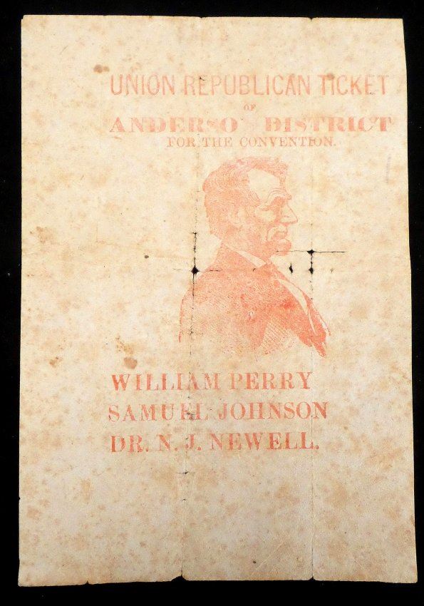 Union Republican Ticket printed in red ink and headed "Anderson District / for the Convention" having three names listed below an unusual bust-length, 1/2 profile, pose portrait of Abraham Lincoln. Candidates listed below Comprise William Perry, Samuel Johnson, and Dr. N.J. Newell.[5 3/8" H x 3 3/4" W]. Age-toning, fading, fold wear with short breaks, foxing, and creases.