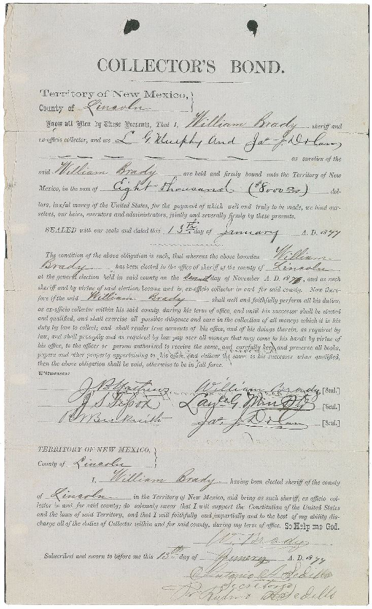 Extremely rare partly-printed DS, signed “William Brady,” one page both sides, 8.5 x 14, January 13, 1877. Collector’s bond issued in the Lincoln County, New Mexico, in part: “Know all Men by These Presents, That I, William Brady sheriff and ex-officio collector, and we L. G. Murphy and Jas. J. Dolan as sureties of the said William Brady are held and firmly bound unto the Territory of New Mexico, in the sum of Eight thousand ($8,000.00) dollars.” Signed at the conclusion by William Brady, Jacob Basil Mathews, Robert W. Beckwith, James J. Dolan, Lawrence G. Murphy, and one other. In fine condition, with a few small tears to edges. Accompanied by a packet of biographical information.
