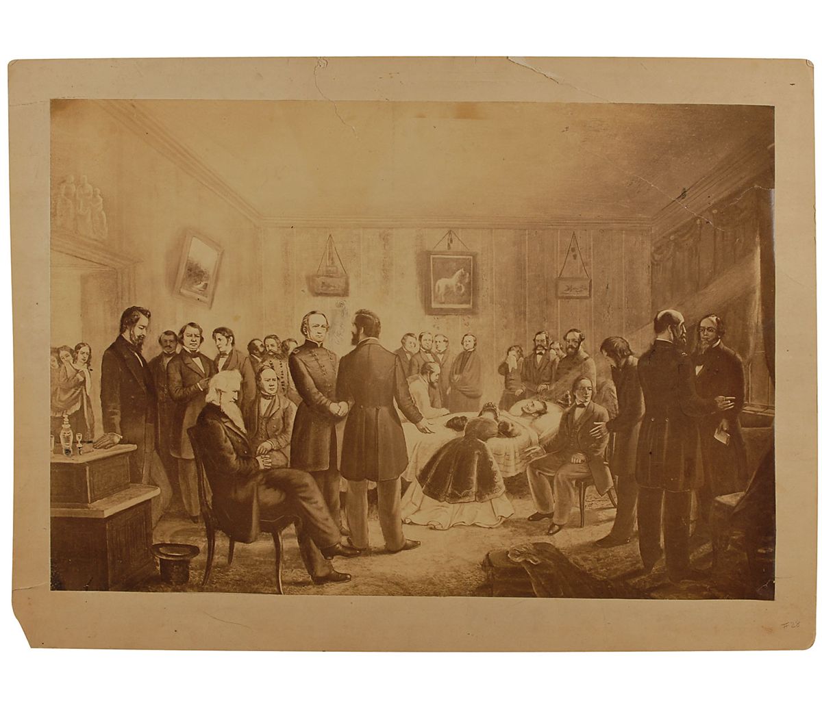 Rare and exceptional original 19 x 14 photo of an artist’s rendition of the Lincoln deathbed scene, showing Mary Todd draped over the fallen president’s body in agony as members of his cabinet look on, affixed to a 21.5 x 17 mount. Noticeable crease to th