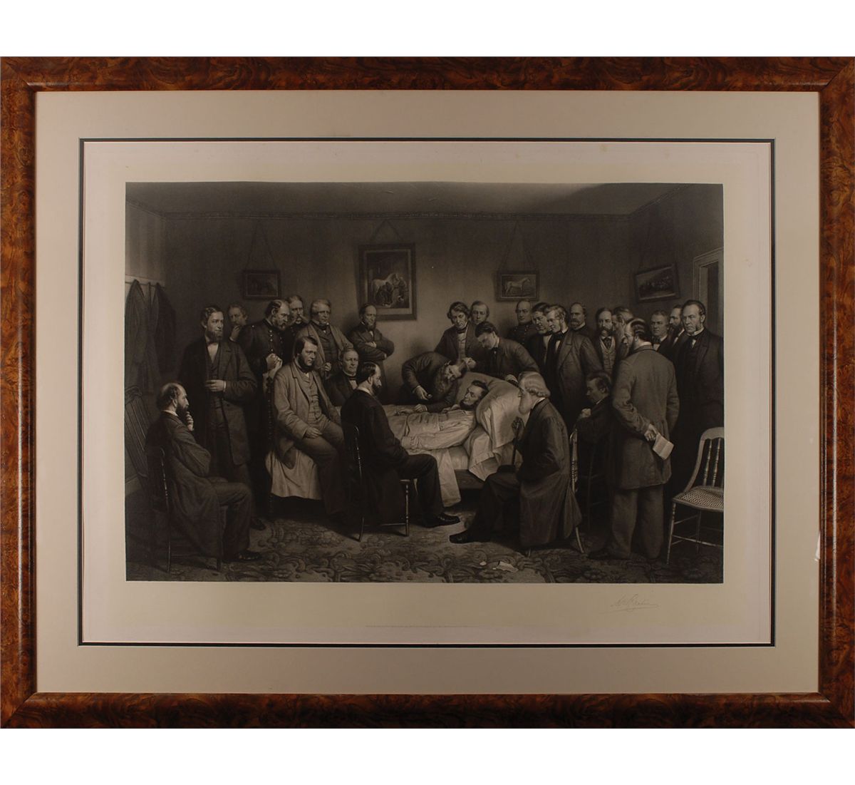 Beautiful ‘proof after letters’ engraving entitled ‘Death of President Lincoln,’ by Alexander Hay Ritchie, 37 x 26.5, depicting 26 mourners surrounding Lincoln’s deathbed, published circa 1868. Signed in lower right border by the artist in pencil, “A. H.