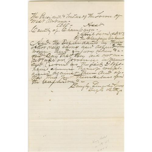 <B>Lincoln Document in an unknown hand,</B></I> signed "Langley, Lincoln & Jones/ Defts Attys". Champaign Co. [Ill.], April 1859, one-half page, folio. In County of Champaign vs President and Trustees of the Town of West Urbana, the defendants claim they "did not undertake or promise in manner and form" as the plaintiffs allege. From the Henry E. Luhrs Collection.
