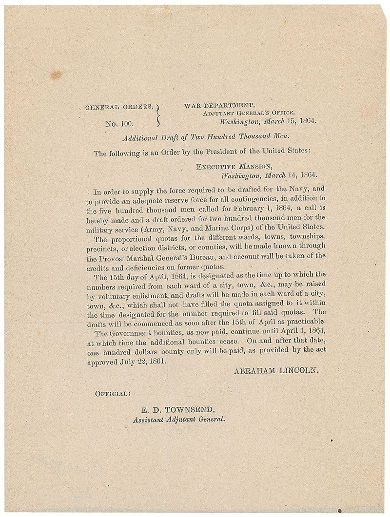 General Orders No. 100, 5.5 x 7.25, one page, issued by President Lincoln through the War Department on March 15, 1864. Lincoln calls for 200,000 more troops. In part: “A call is hereby made and a draft ordered for two hundred thousand men for the military service (Army, Navy, and Marine Corps) of the United States…The drafts will be commenced as soon after the 15th of April as practicable.” Intersecting folds, a few light wrinkles, a couple spots of soiling, and a trivial tear to the top edge, otherwise fine condition.