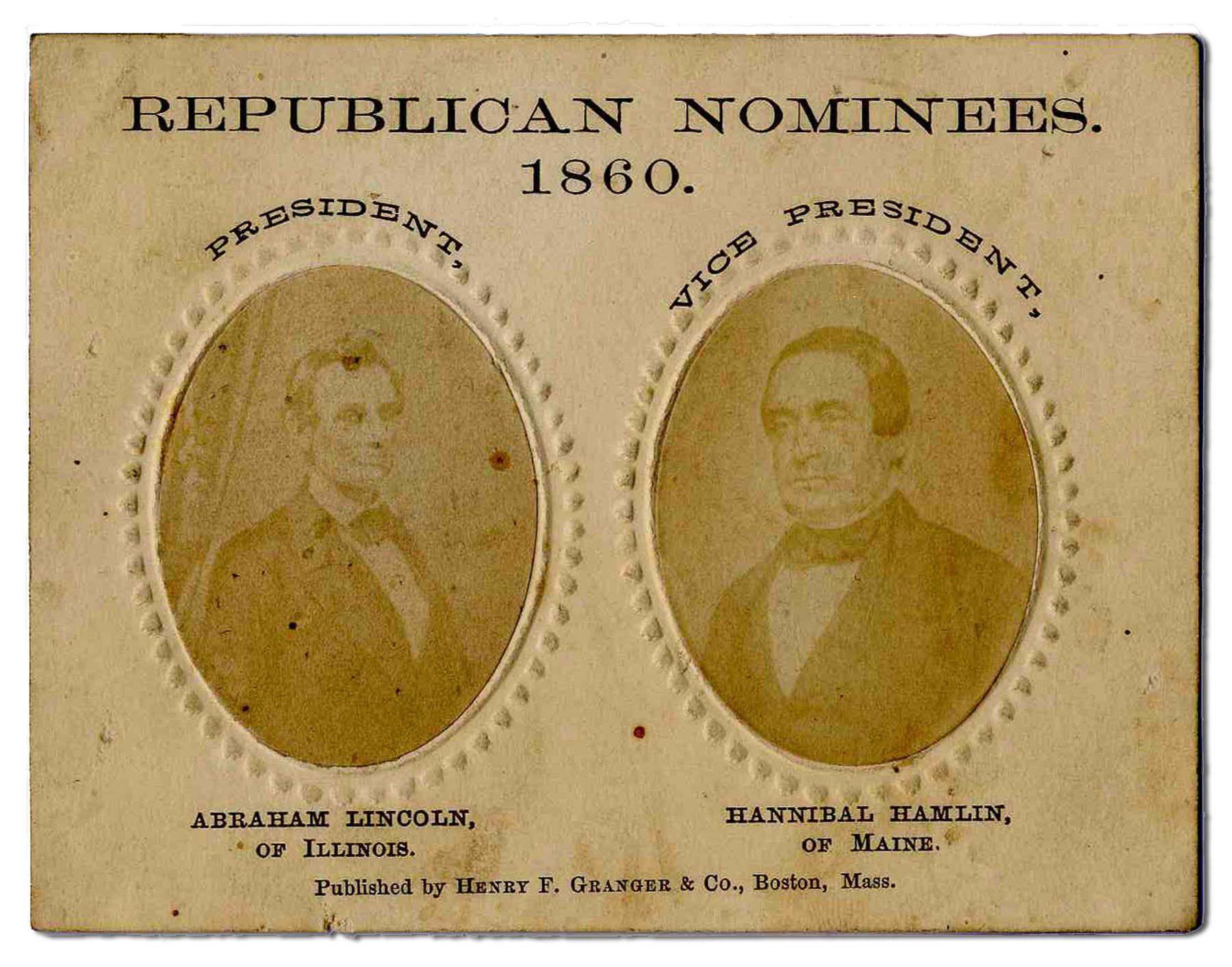 President-elect Abraham Lincoln and Vice President-elect Hannibal Hamlin very scarce 1860 election jugate, depicting each candidate in side-by-side portrait engravings. Political jugates of the Republican nominees were distributed during the tumultuous days leading up to the election of 1860, as Americans wrestled with slavery and wondered how a new Administration would affect it. Portrait engravings of the candidates are printed on a card published by Henry F. Granger & Co. of Boston, Massachusetts. Jugate reads: ''Republican Nominees. 1860.'' With Lincoln and Hamlin's portraits depicted as ''President'' and ''Vice President'' and ''Abraham Lincoln, of Illinois'' and ''Hannibal Hamlin, of Maine'' additionally printed. Jugate, measuring 4.25'' x 3.25'', has minor foxing and toning throughout, with each portrait faded and with a very tiny tear along bottom edge. Very good condition.