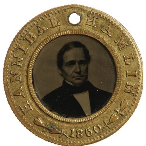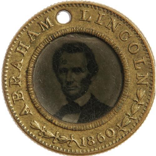 <B>1860 Lincoln/Hamlin Campaign Ferrotype, Featuring the Beloved Brady "Cooper Union" Pose.</B></I> Basically a choice example, with some minor issues: The Lincoln ferro itself has a tiny edge chip at the top, which occurred in manufacture. There is one spot on Lincoln's forehead, and the Lincoln side has a deceptive appearance of being slightly worn, owing to the nature of the emulsion surface as manufactured. We are not sure how this example will photograph, but "in person" it looks nicer than it sounds! Diameter 24mm.
