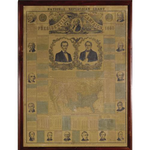 <B>Lincoln & Hamlin: A Rare Large 1860 Jugate "National Republican Chart."</B></I> Bold central image of the two running mates shortly after their nomination at the Chicago Convention, May 18, 1860. Surrounding the portraits is the zigzag image of a split rail fence. Below is a map indicating free and slave states and territories, presaging the issue which would dominate Lincoln's presidency. Around the perimeter are portraits and short biographies of each of the first 15 U.S. presidents. <BR><BR>These large political posters, often designated as "charts" first appeared in the mid 1850s. That appellation doubtless comes from the fact that they often conveyed detailed information and statistics, as well as picturing the candidates. Some of the earliest versions depicted all the candidates, but the style featuring a single party's ticket emerged in 1860. Such jugate charts are seen for every major ticket through 1884, save for the 1864 election, and are much sought after by collectors. Condition is often an issue with these, as they tend to be found with paper staining, cracks and flaking. The present example is in distinctly superior condition. The paper has evenly aged to a beige tone, but it is remarkably free of damage or defects, having only two trivial small stain marks near right and left edge. One of the nicest and most colorful large political display items from Lincoln's campaign, and doubly desirable for its jugate portraits. Measures 26" x 36".<BR><BR><b>Shipping:</b> Framed - with Glass, Large (<a target="_blank" href="http://www.heritageauctions.com/common/shipping.php">view shipping information</a>)