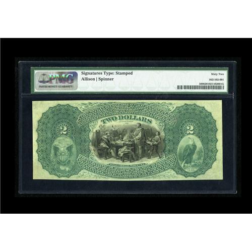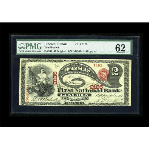 <B>Lincoln, IL</B></I> - $2 Original Fr. 389 <B>The First NB</B></I> Ch. # 2126<BR>One of the classic hoard Lazy Twos, this note is fresh and bright and would have certainly been certified at an even higher level with a bit more margin at lower right. <B>PMG Uncirculated 62.</B></I><BR><BR><b>Shipping:</b> Coin/Currency (<a target="_blank" href="http://www.heritageauctions.com/common/shipping.php">view shipping information</a>)