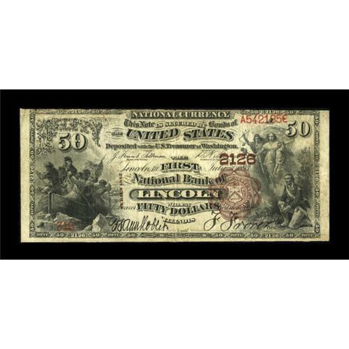 <B>Lincoln, IL</B></I> - $50 1882 Brown Back Fr. 516 <B>The First NB</B></I> Ch. # 2126<BR> An extremely scarce type and denomination from any state, and in just the condition that collectors appreciate. Bright <B>Fine-Very Fine,</B></I> with a close top margin more than offset by vivid colors and sharp pen signatures.<BR><BR><BR><b>Shipping:</b> Coins & Currency (<a target="_blank" href="http://www.heritageauctions.com/common/shipping.php">view shipping information</a>)