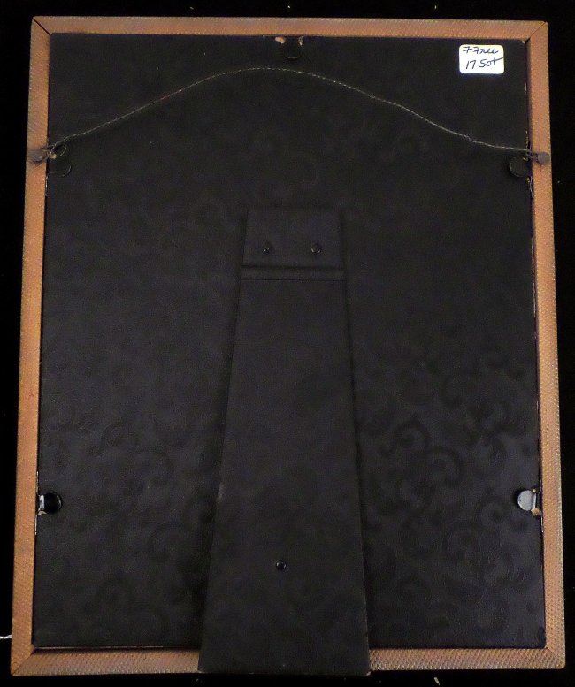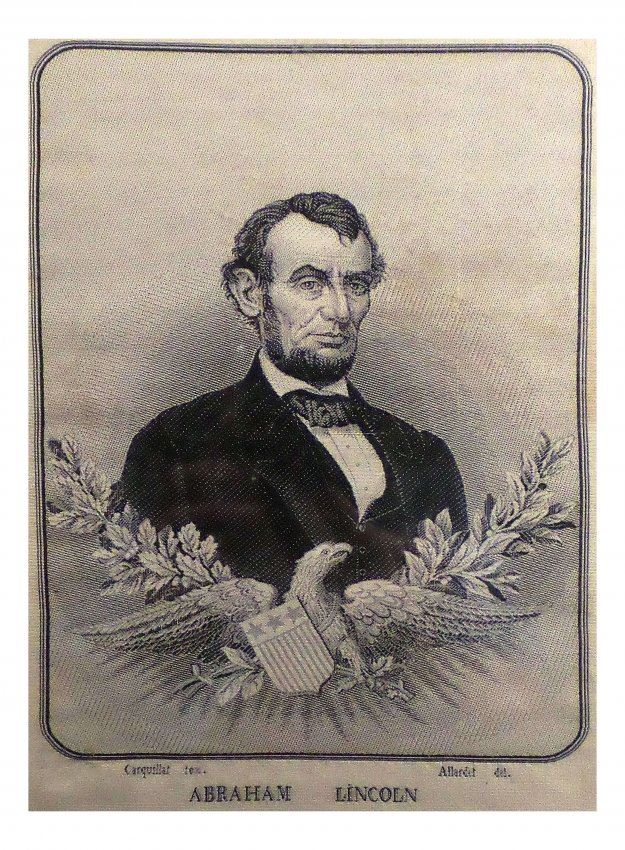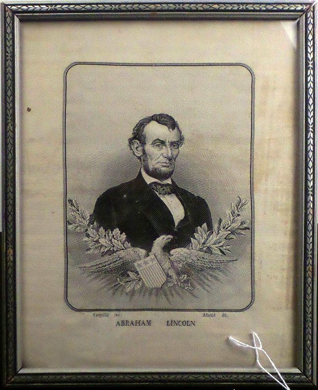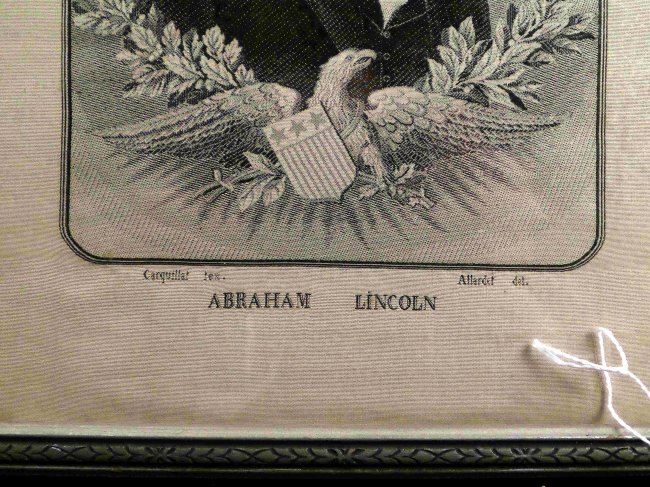 Stevengraph portrait depicting Lincoln in a bust-length, 3/4 profile, pose. Image is contained within an ornate surround featuring an eagle and federal shield flanked by laurel leaves. Titled" Abraham Lincoln." Imported for the American market, it is imprinted "Carquillen Tex...Allardet del." below the portrait [Image: 7" H x 5-1/2" W]. Framed under glass [10-3/4" H x 9" W]. Age-toning and stains.