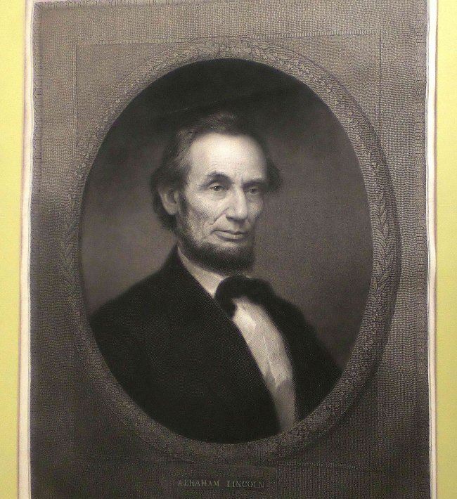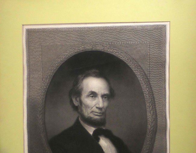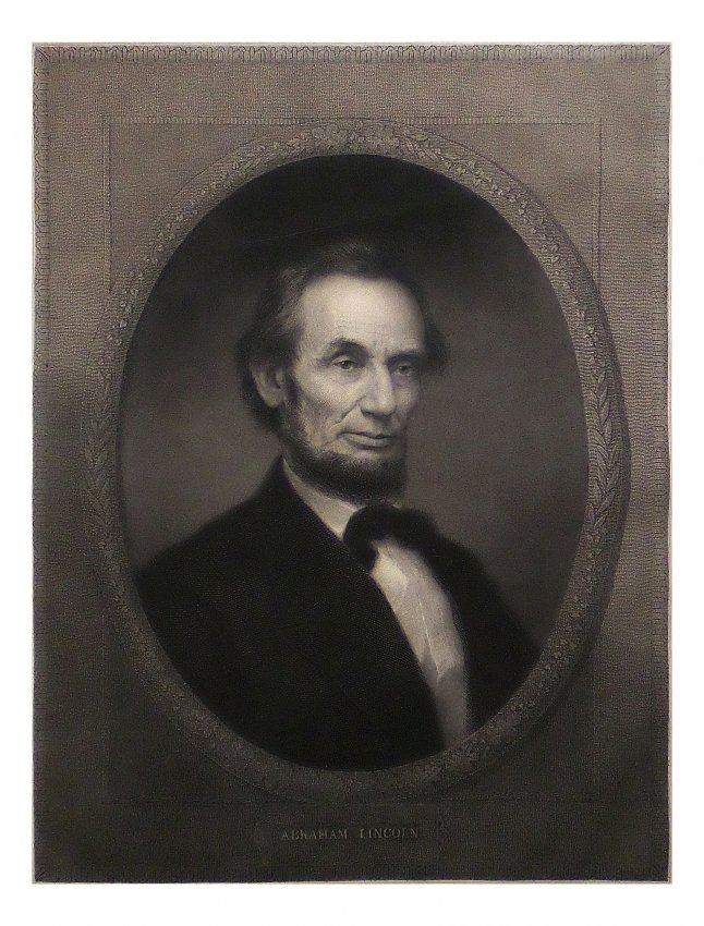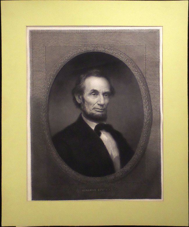 Vintage engraved oval portrait of Abraham Lincoln in a bust-length, 3/4-profile, pose with oak leaf and laurel surround. Unsigned and undated.[Image: 20-3/4" x 15-3/4"; Sheet 25-3/4" x 19-1/2]. Mounted to a matte [27-1/8 x 22-1/2"] with masking tape on verso at edges. Bears loss in margin at top right (not affecting image).