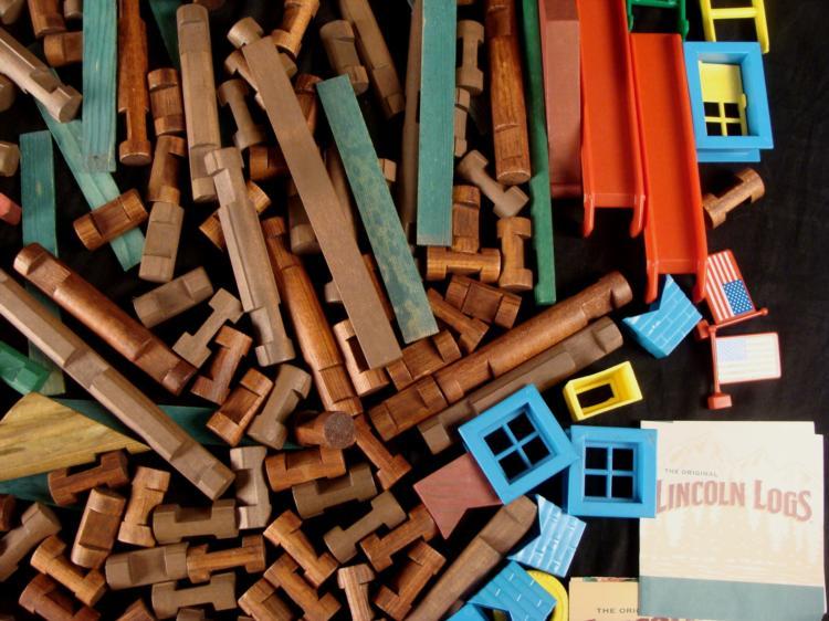 Here is a big group of assorted Lincoln Logs building pieces, all in very good condition. They date back a few years, and are the classic wood. The pieces are uncounted, so please see the pictures for everything you'll receive. There are many standard logs, and red and green wooden roof pieces. Two pieces of paperwork are included. There are also a few plastic pieces from Playskool thrown in. * Lincoln logs have never really changed, and if you'd like to expand on your set, or just get started, this is a great way to start. *