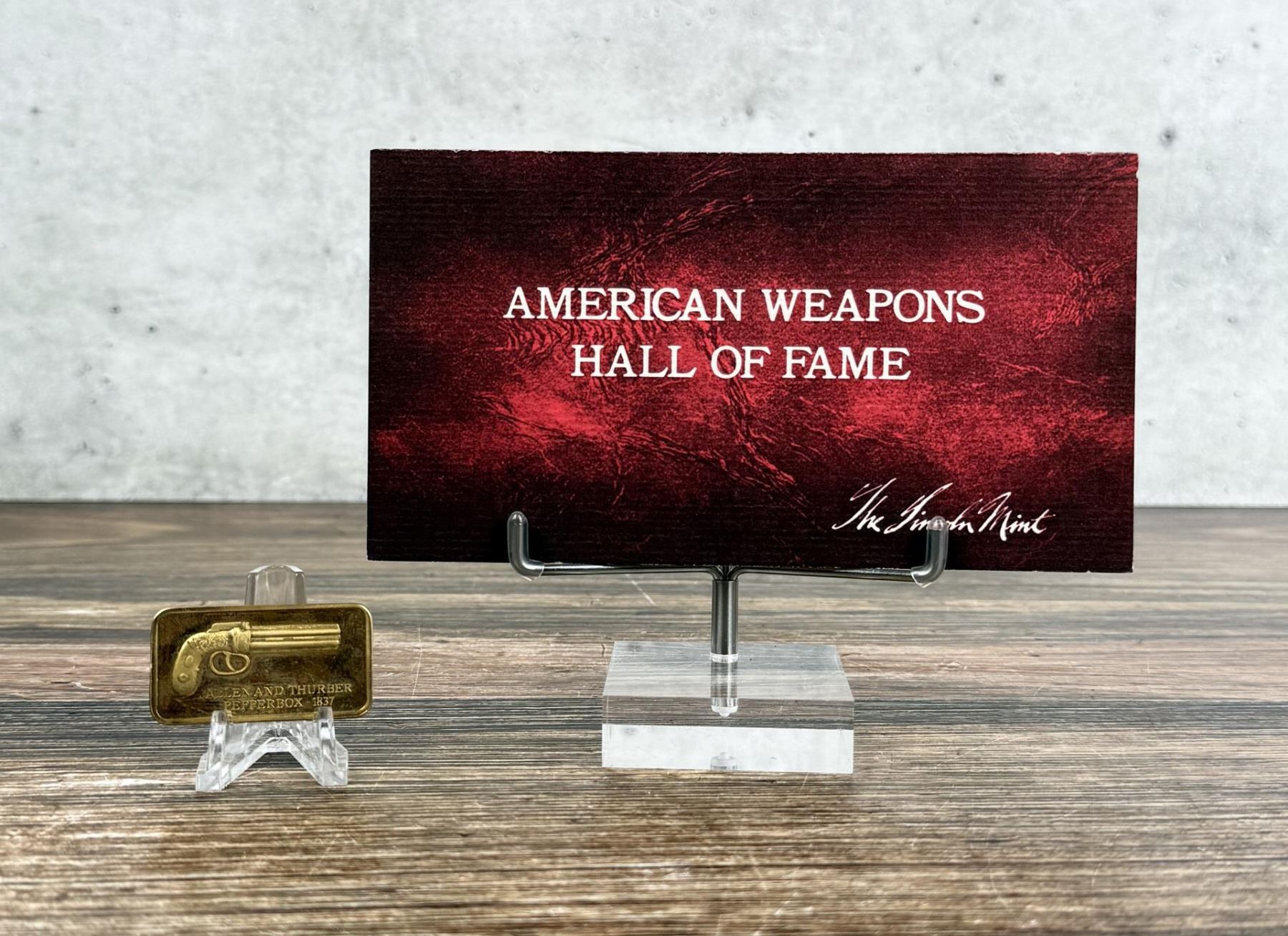 Bar - Issue No. 3 of the American Weapons Hall of Fame by the Lincoln Mint. The Allen & Thurber Percussion Pepperbox Revolver. 32.12 grams of 24K Gold Plated Silver. Measures 1 5/8" by 7/8"