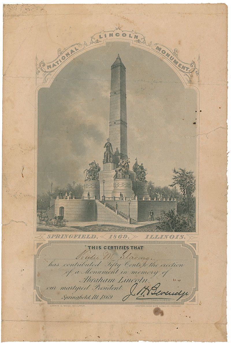 Certificate featuring an engraving of the National Lincoln Monument in Springfield, Illinois, 6 x 9, 1869, proving that the bearer “has contributed Fifty Cents to the erection of a Monument in memory of Abraham Lincoln, our martyred President.” Bears a fa