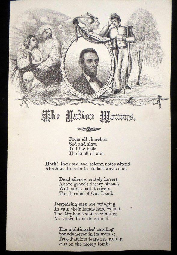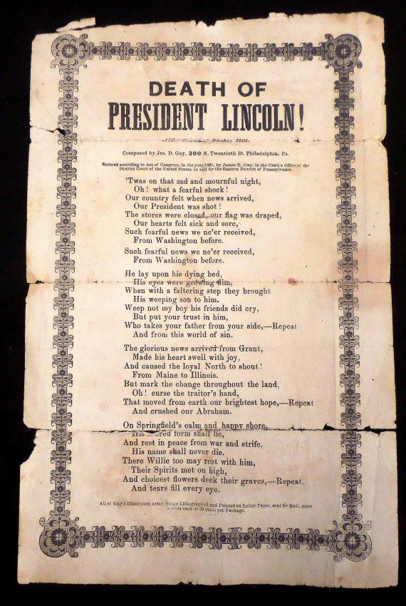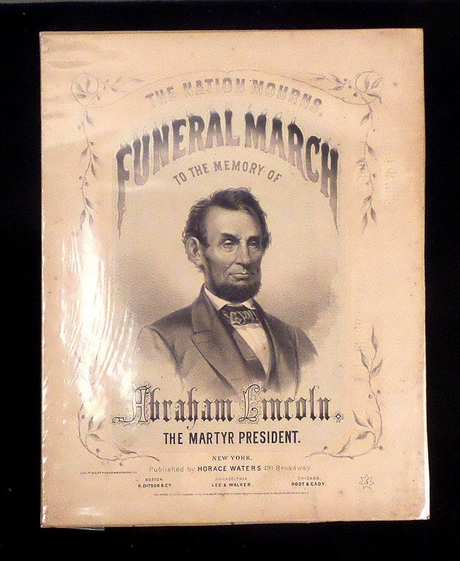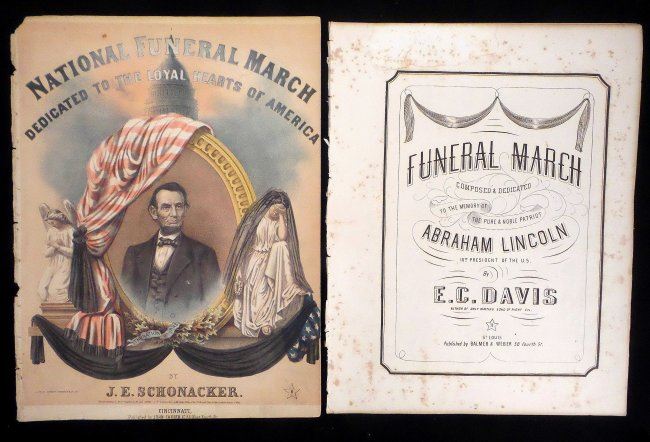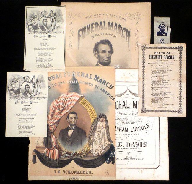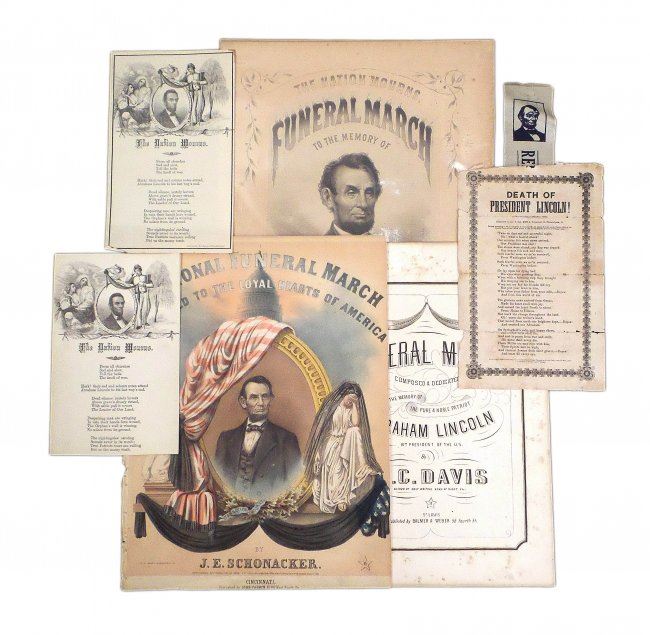 Comprises 1.) Two printed mourning song sheets by Charles Magnus of New York, titled "The Nation Mourns," featuring a vignette along the upper edge [7-3/8" H x 5" W]. Minor age-toning and bottom edge trimmed. 2.) Lincoln assassination poem handbill titled "Death of President Lincoln!...composed by Jas. D. Gay," 1865 [8-7/8" H x 5-3/4" W]. Age-toning, horizontal fold wear causing large tears, and light staining. 3.) Printed silk ribbon depicting a portrait of Lincoln and boldly imprinted "Republican" [6" H x 2" W]. 4.) Three Lincoln memorial song sheets: "National Funeral March Dedicated to the Loyal Hearts of America" by J.E. Schonacker, 1865; "Funeral March " by E.C. Davis; and "The Nation Mourns, Funeral March to the Memory of Abraham Lincoln" published by Horace Waters. Condition varies, all sold together as is. Defects include foxing, age-toning, creasing, fold wear, and tears.
