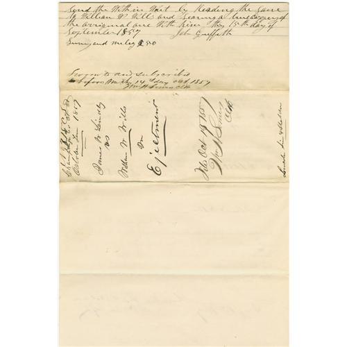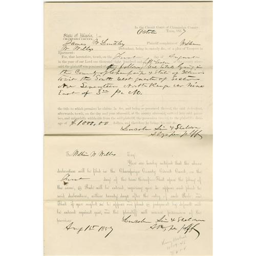 <B>Lincoln Partly Printed Document,</B></I> signed twice in an unknown hand "Lincoln, Linn & Sheldon / Attys for plff". Champaign Co., Ill., October 1857, one page, folio. James W. Lindley complains that William W. Wells "unlawfully withholds" possession of a quarter-section of land in Champaign County, to his damage of $1000. A notice at the bottom of the page advises Wells that he must "appear and plead" or suffer judgment by default "and the plaintiff will recover possession…" From the Henry E. Luhrs Collection.