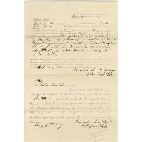 <B>Lincoln Partly Printed Document,</B></I> signed twice in an unknown hand "Lincoln, Linn & Sheldon / Attys for plff". Champaign Co., Ill., October 1857, one page, folio. George Hareslan(?) complains that William Keeble "unlawfully withholds" a quarter-section of land in Champaign County, to his damage of $1000. Keeble is ordered to appear and plead or suffer judgment by default "and the plaintiff will recover possession…" From the Henry E. Luhrs Collection.