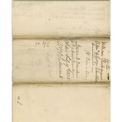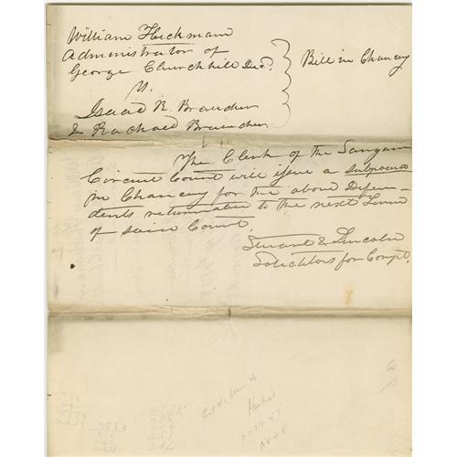 <B>Lincoln Law Partner, John Todd Stuart.</B></I> Autograph Document Signed "Stuart & Lincoln Solicitors for Compt." Sangamon Co. (Ill.), no date (docketed February 1838). The clerk is directed to issue subpoenas in chancery for Isaac R. and Rachael Braucher in a suit brought by William Hickman, administrator of George Churchill, deceased. Very early: dated less than a year after Lincoln had begun the regular practice of law. Stuart and Lincoln won this suit, securing a $481.69 judgment. From the Henry E. Luhrs Collection.