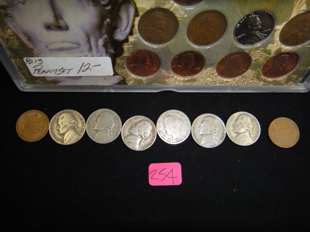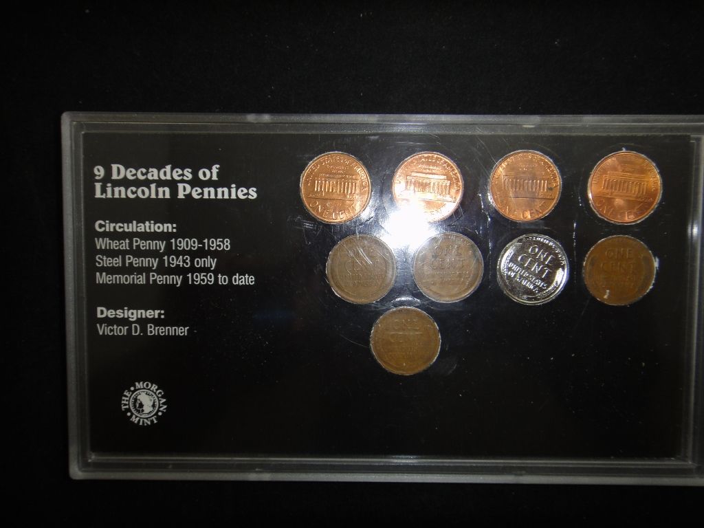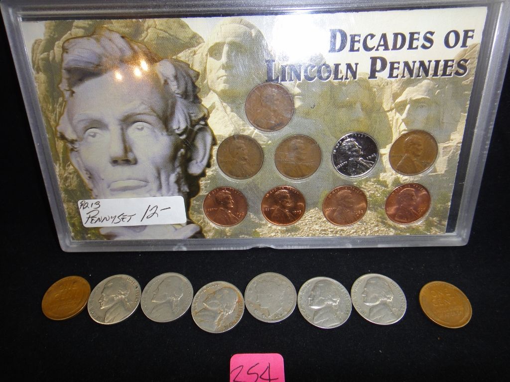 Includes 9 decades of Wheat pennies along with additional Wheaties, V and Jefferson Nickels. All one money.