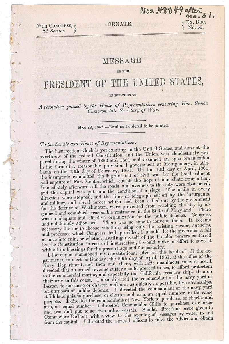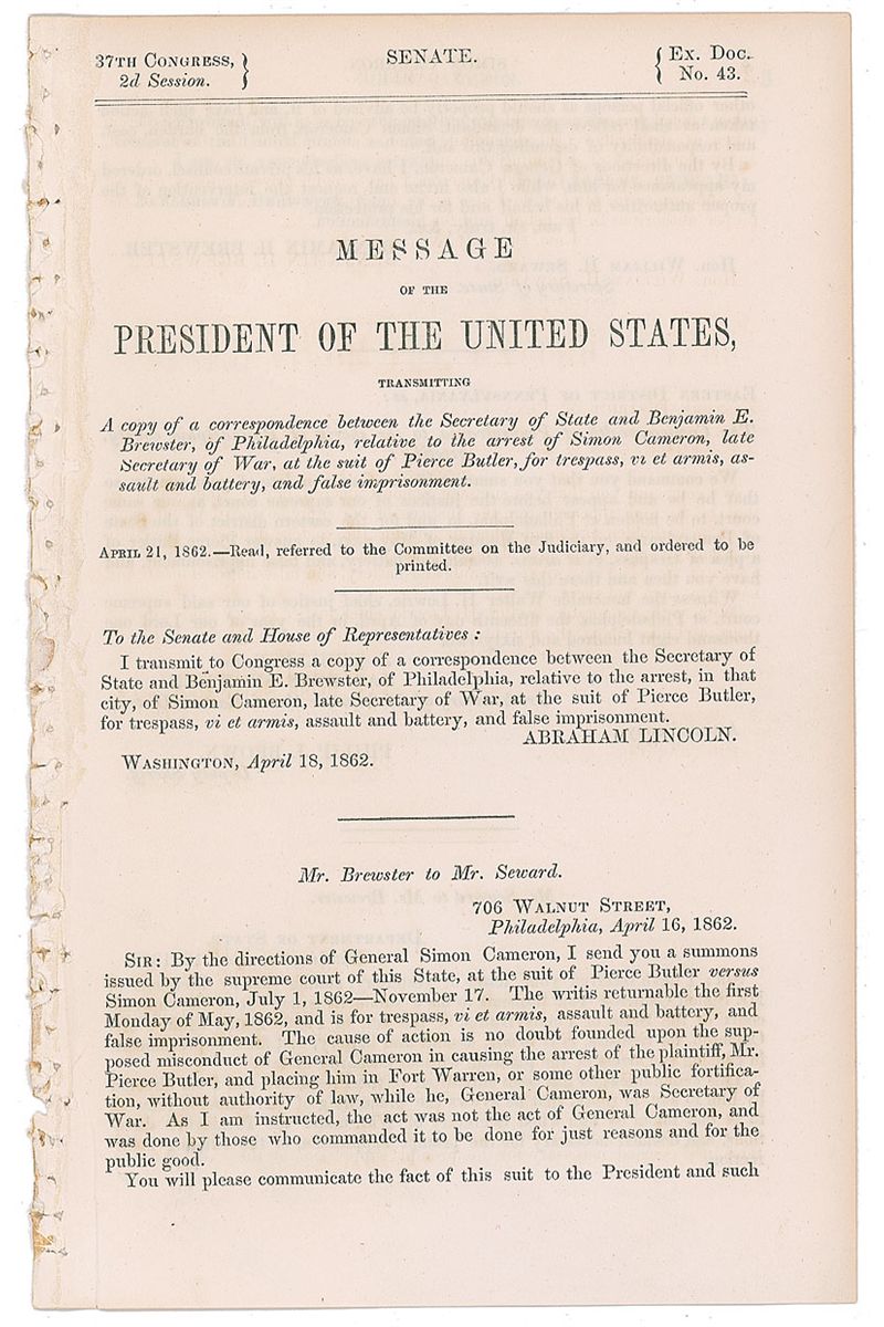 Two printed presidential messages to the 37th Congress: one three-pages on two adjoining sheets, 5.5 x 8.5, April 21, 1862, transmitting a “copy of correspondence between the Secretary of State and Benjamin E. Brewster, of Philadelphia, relative to the arrest…of Simon Cameron, late Secretary of War, for trespass, vi et armi, assault and battery, and false imprisonment;” and one one one-page both sides, 5.5 x 8.5, May 28, 1862, regarding a “resolution passed by the House of Representatives censuring the Hon. Simon Cameron, late Secretary of War.” Numerous binding holes and cuts to left borders, and an ink notation to the top of one, otherwise fine condition.