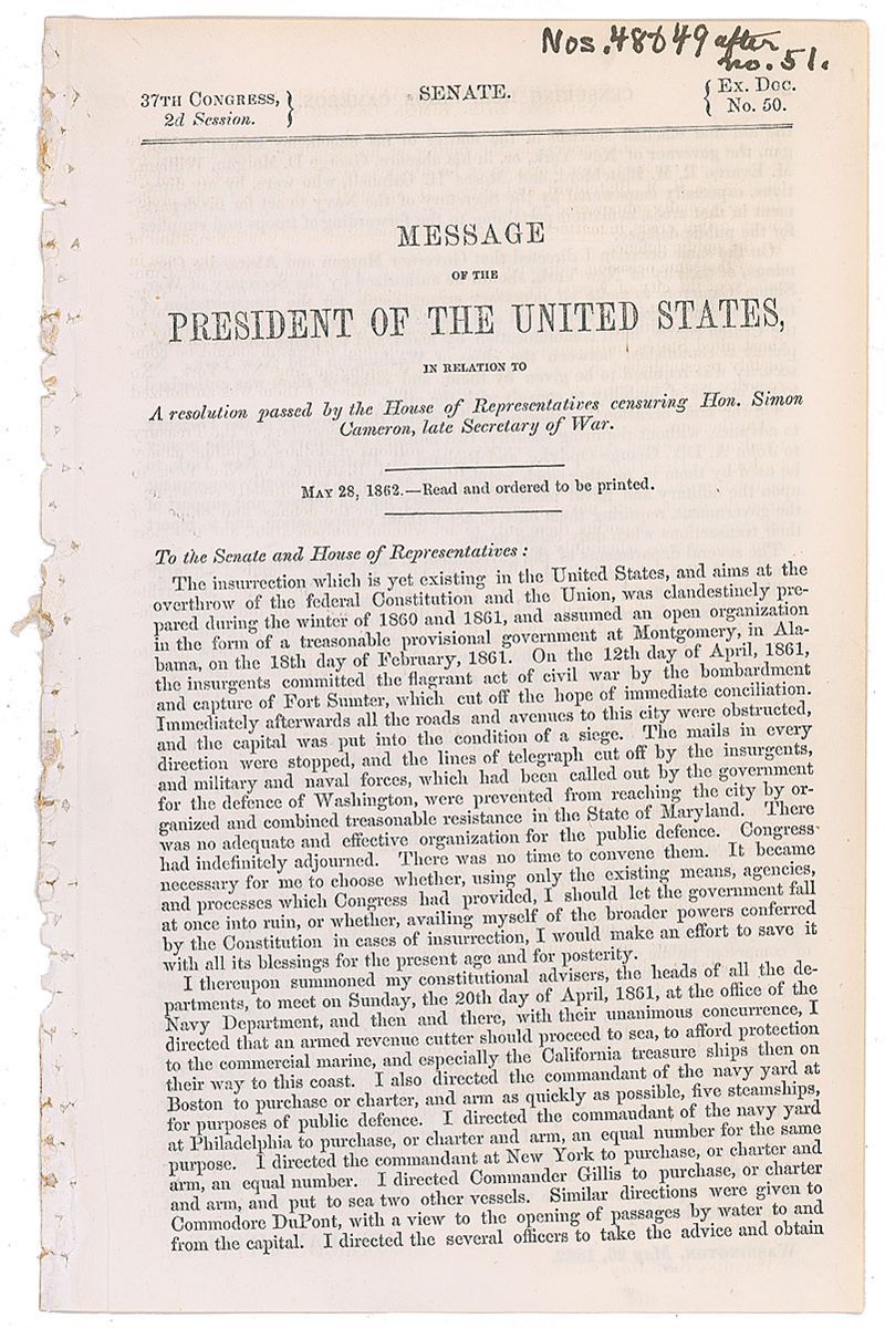 Two printed presidential messages to the 37th Congress: one three-pages on two adjoining sheets, 5.5 x 8.5, April 21, 1862, transmitting a “copy of correspondence between the Secretary of State and Benjamin E. Brewster, of Philadelphia, relative to the arrest…of Simon Cameron, late Secretary of War, for trespass, vi et armi, assault and battery, and false imprisonment;” and one one-page both sides, 5.5 x 8.5, May 28, 1862, regarding a “resolution passed by the House of Representatives censuring the Hon. Simon Cameron, late Secretary of War.” Numerous binding holes and cuts to left borders, and an ink notation to the top of one, otherwise fine condition.