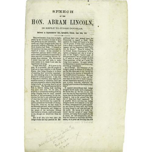 <B>Abraham Lincoln Printed Speech "In Reply To Judge Douglas" dated June 26, 1857</B></I> A printed copy of "Speech of the Hon. Abram sic Lincoln, in Reply to Judge Douglas. Delivered in Representatives' Hall, Springfield, Illinois, June 26th 1857", 7pp. 8vo., unbound folded sheet, uncut with wide margins. This is a scarce and early imprint of a speech given by Lincoln responding to a speech given by Stephen Douglas two weeks earlier and addresses mainly the Dred Scott decision. In part:"...That decision declares two propositions -- first, that a negro cannot sue in the U.S. Courts; and secondly that Congress cannot prohibit slavery in the Territories. It was made by a divided court -- dividing differently on the different points...I have said, in substance , that the Dred Scott decision was, in part, based on assumed historical facts which were not really true...Judge Taney, in delivering the opinion of the majority of the Court, insists at great length that negroes were no part of the people who made, or for whom was made, the Declaration of Independence, or the Constitution of the United States. On the Contrary, Judge Curtis, in his dissenting opinion shows that in five of the thirteen States...free negroes were voters, and, in proportion to their numbers, had the same part in making the Constitution the white people had..." This is an important speech, and Lincoln would use many of the same arguments in his famous House Divided speech made a year later before a thousand Republican delegates in Springfield who would choose him to run against Stephen Douglas for the U.S. Senate. This imprint is in good to very good condition with minor separations at the folds, a few small tears at margins, negligible foxing, but with such wide margins that the text remains unaffected. Very bright paper, and dark print.<BR><BR><b>Shipping:</b> Small Flat (<a target="_blank" href="http://www.heritageauctions.com/common/shipping.php">view shipping information</a>)
