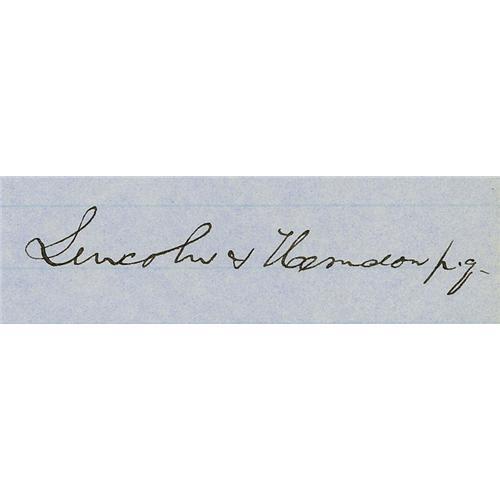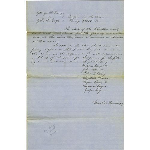 <B>Abraham Lincoln Requests Witnesses for Case in Which a Man is Accused of Fathering an Illegitimate Child</B></I> ADS: "<I>Lincoln & Herndon p.q.,</B></I>" 1p, 8" x 12". Christian County [Illinois], September 12, 1849. Headed by Lincoln: "<I>George D. Berry/vs./John S. Cagle/Trespass on the case- Damage $1000-00-.</B></I>" Lincoln continues: "<I>The clerk of the Christian county circuit court will please file the foregoing declaration, and, at the same time, issue a summons in the above entitled cause-- So soon as the clerk shall receive satisfactory information, that process has been served in this cause on the defendant, he will please issue in behalf of the plaintiff, Subpoenas for the following named witnesses to wit: Elizabeth Berry, Mildred Campbell, John Saunders, Robert E. Berry, Elizabeth Weeden, Susan Berry, Leonard Cagle, Jasper Cagle-</B></I>" On verso in another hand: "Filed Sept 12/1849/W.S. Moore". George D. Berry, Lincoln & Herndon's client, sued John S. Cagle for trespass. <B>The declaration Lincoln wrote, which he has asked the clerk to file, alleged that John S. Cagle caused George D. Berry's daughter Elizabeth Berry to bear an illegitimate child and be sick for nine months. Lincoln & Herndon asked for $1000 in damages. Heading their witness list: Elizabeth Berry. It is interesting to note that the baby was already born, that it was not the mother bringing suit against the man who fathered her child, but her father - and the crime allegedly committed was "Trespass".</B></I> The law firm of Lincoln & Herndon was formed in 1843. The partnership continued, nominally at least, until Lincoln's death in 1865. Lightly browned at folds. In fine condition. From the Henry E. Luhrs Collection.