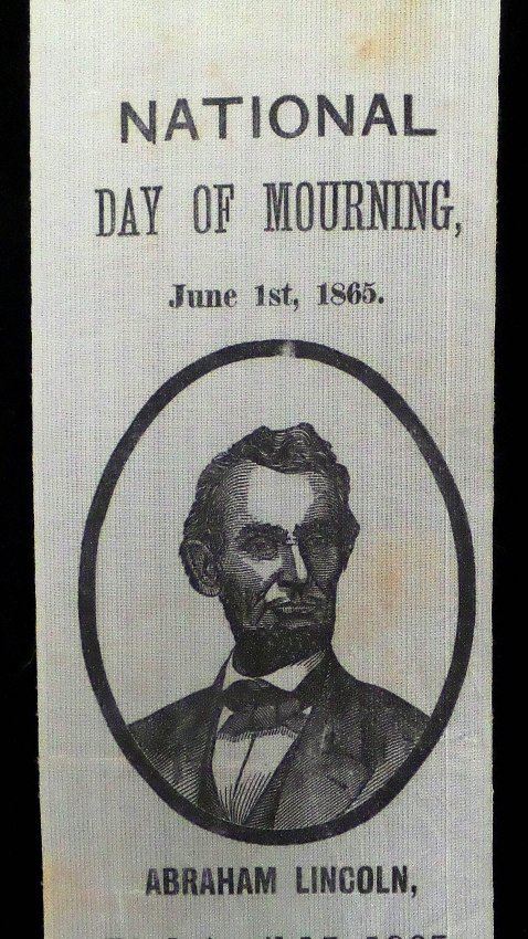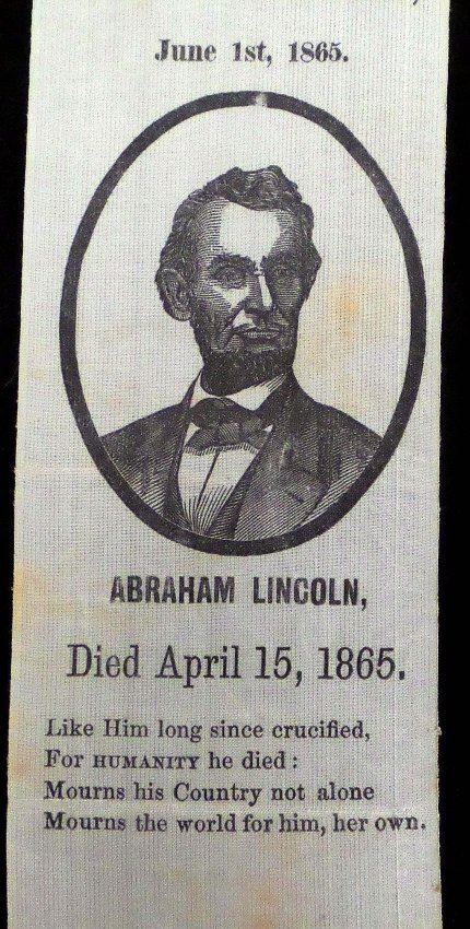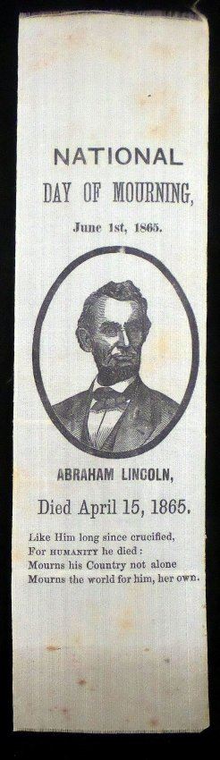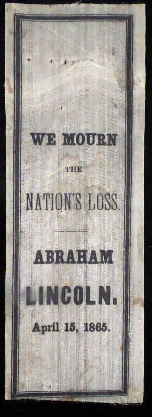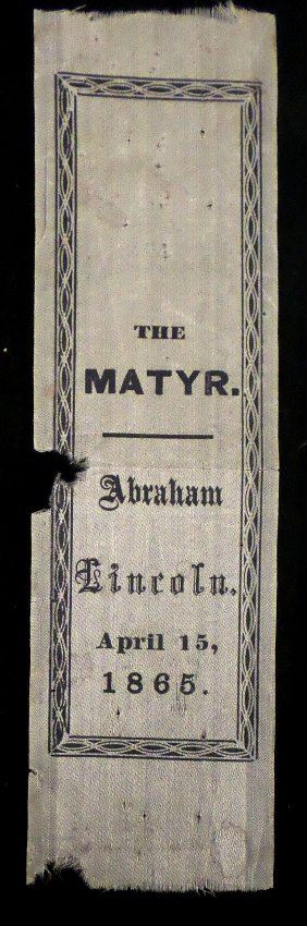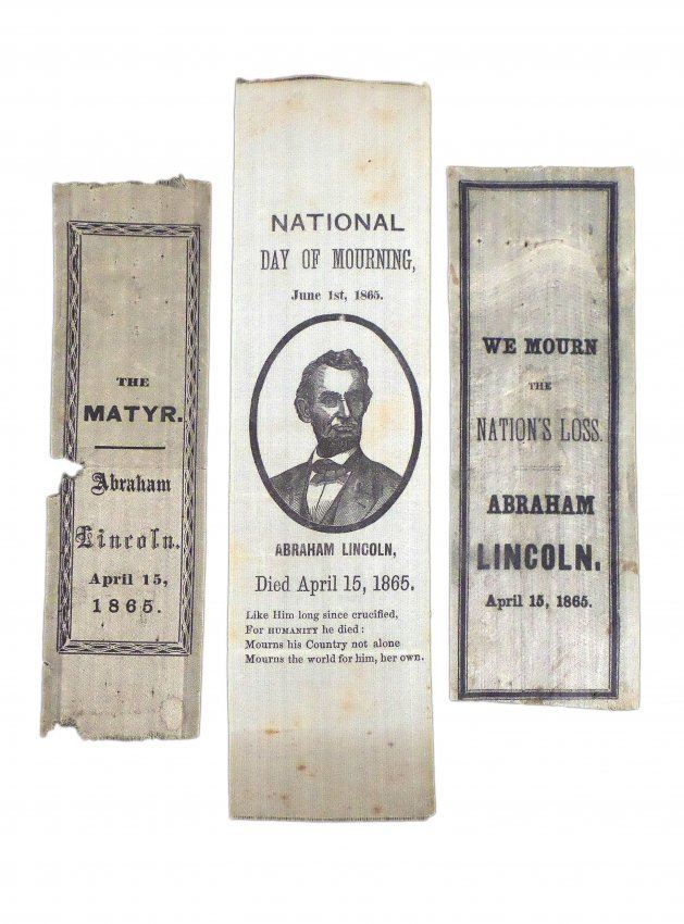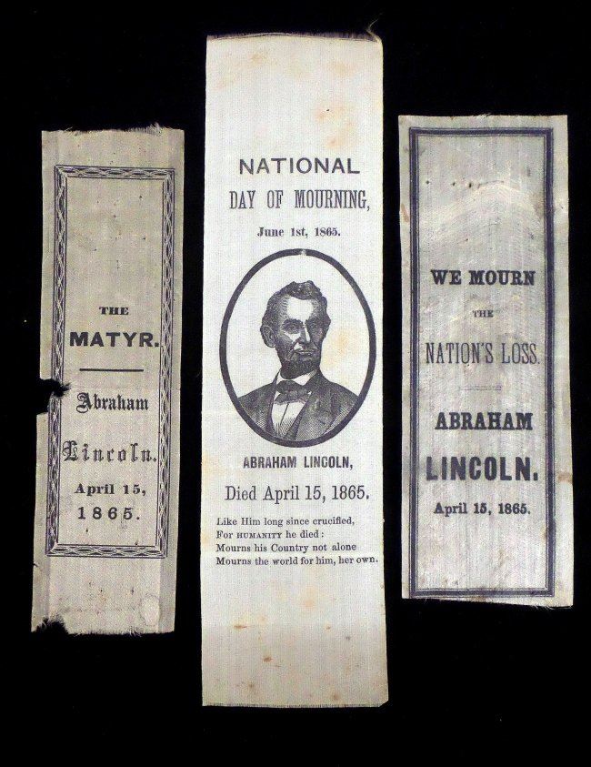 Comprising 1.) Ribbon issued in the wake of Lincoln's assassination. Features mourning borders and reads "We Mourn the Nation's Loss / Abraham Lincoln, April 15, 1865" [5-3/8" H x 2" W]. Age-toning, stains, small holes, uneven edges, and creases. 2.) Silk mourning ribbon bearing an oval portrait of Abraham Lincoln titled "National Day of Mourning, June 1st, 1865 / Abraham Lincoln Died April 15, 1865", bears poem at bottom "Like Him long since crucified, For HUMANITY he died: Mourns his Country not alone Mourns the world for him, her own." [7-3/8" H x 2" W]. Stains throughout. 3.) White silk mourning ribbon printed with a black mourning border and the words "THE MARTYR Abraham Lincoln April 15, 1865." [5-1/2" H x 1-1/2" W]. Age-toning, small tears with losses, creases, and minor fraying at top and bottom edges.