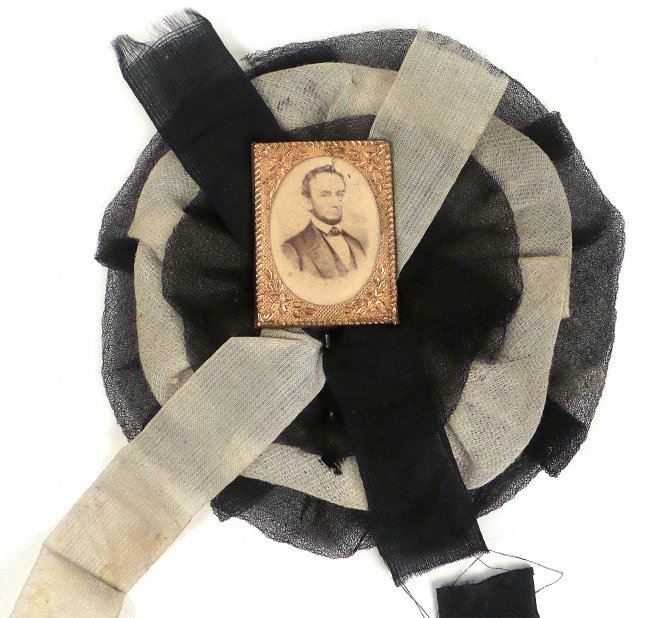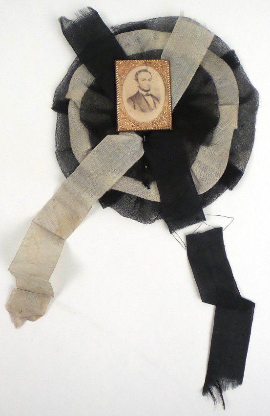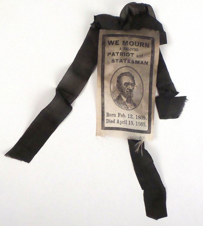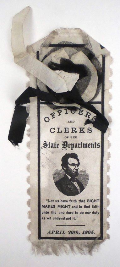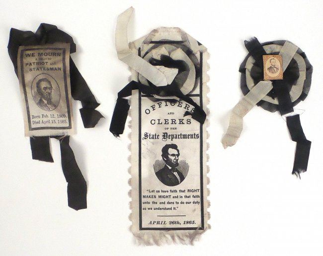 Comprises 1.) Black and white silk ribbon featuring a bust-length, 1/2 profile, vignette portrait of Abraham Lincoln surmounted by a silk rosette with the printed title "Officers and Clerks of the State Departments." Bears quote "'Let us have faith that RIGHT MAKES MIGHT and in that faith unto the end dare to do our duty as we understand it.' ... APRIL 26th, 1865" [8-1/8" H x 3-1/4" W]. Ribbon bears ruffled edge and mourning borders. Frayed top and bottom edges, rosette creased and flattened, fold wear, bears a faint illegible vertical pencil inscription at center left, and very light age-toning. 2.) Black and white silk rosette mourning ribbon, featuring a salt print portrait of Abraham Lincoln contained within a small rectangular gilt brass frame [Image: 3/4" H x 1/2" W; Frame: 1-1/8" H x 7/8" W; Rosette diameter: 3" Dia]. Age-toning, areas of silk ribbon are tearing off, and few stains. 3.) Black and white silk mourning ribbon featuring an oval vignette portrait of Abraham Lincoln titled "We Mourn a Beloved Patriot and Statesman / Born Feb. 12, 1809 / Died April 15, 1865". Retains three original black silk shroud ribbons [Ribbon: 4" H x 2" W; Overall including shroud ribbons: 8 1/4" H x 2 1/2" W]. Age-toning, frayed bottom edge, creasing, and light stains.