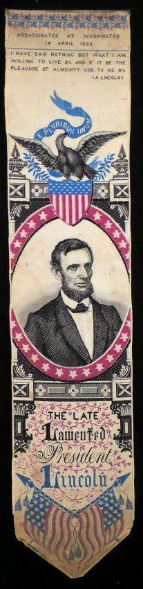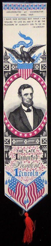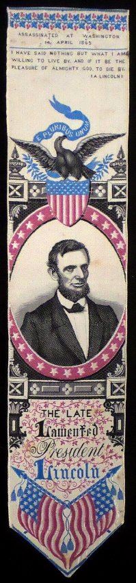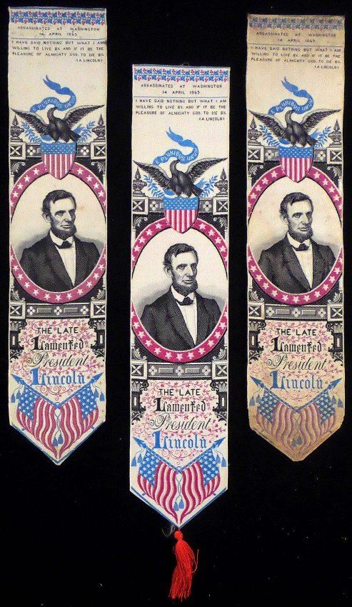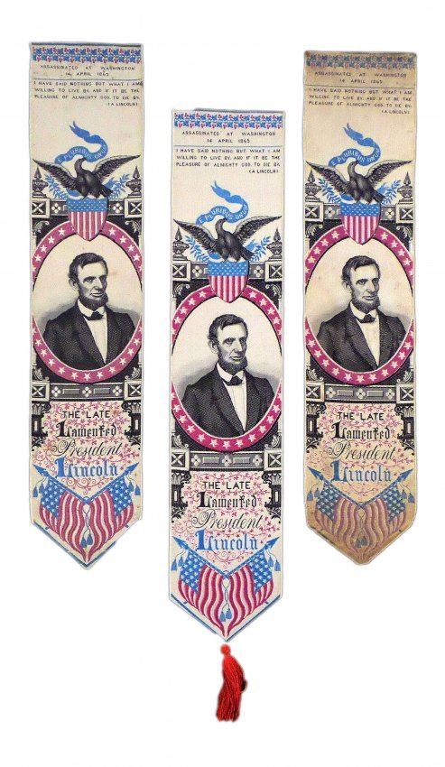 Three ribbons composed of woven purple, blue, and black silk against white backgrounds. All are boldly titled at bottom "The Late Lamented President Lincoln" and imprinted at top "Assassinated at Washington 14 April 1865 / I have said nothing but what I am willing to live by, and if it be the pleasure of almighty God, to die by..." [Each ribbon 10" x 2-1/8"] One ribbon retains original red tassel at bottom. Condition varies from fair to very good with defects including age-toning, minor foxing, and some soiling.